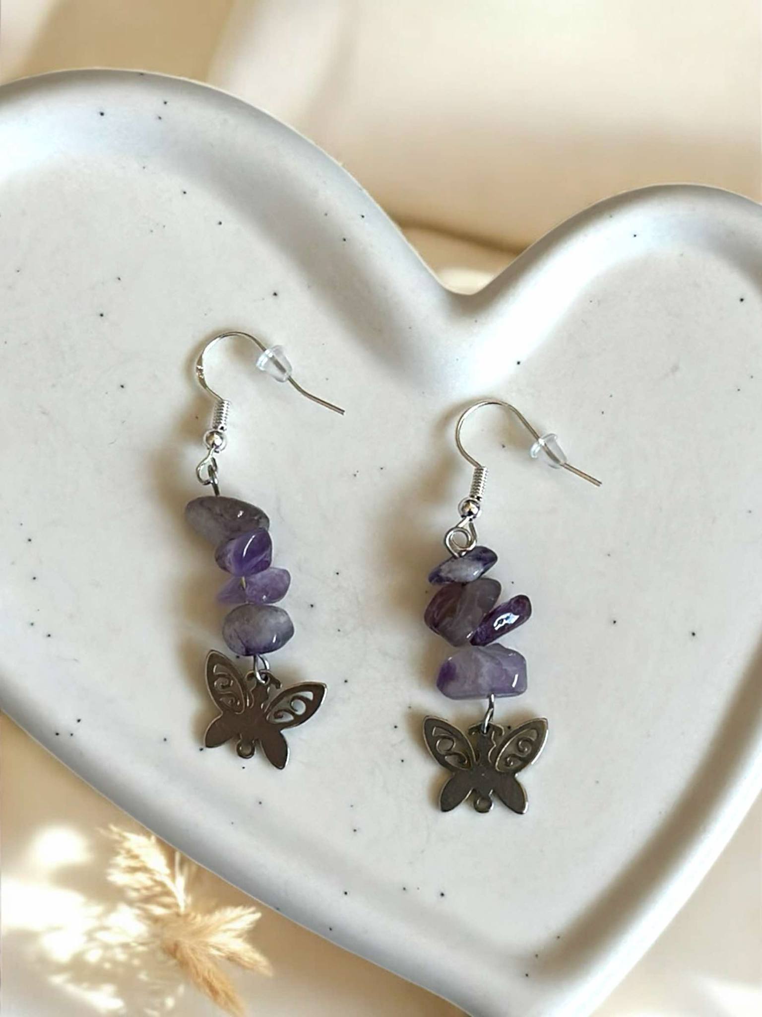 Boucles pendantes en améthystes naturelles et papillons argentés. Élégantes, faites main et pleines de douceur spirituelle.