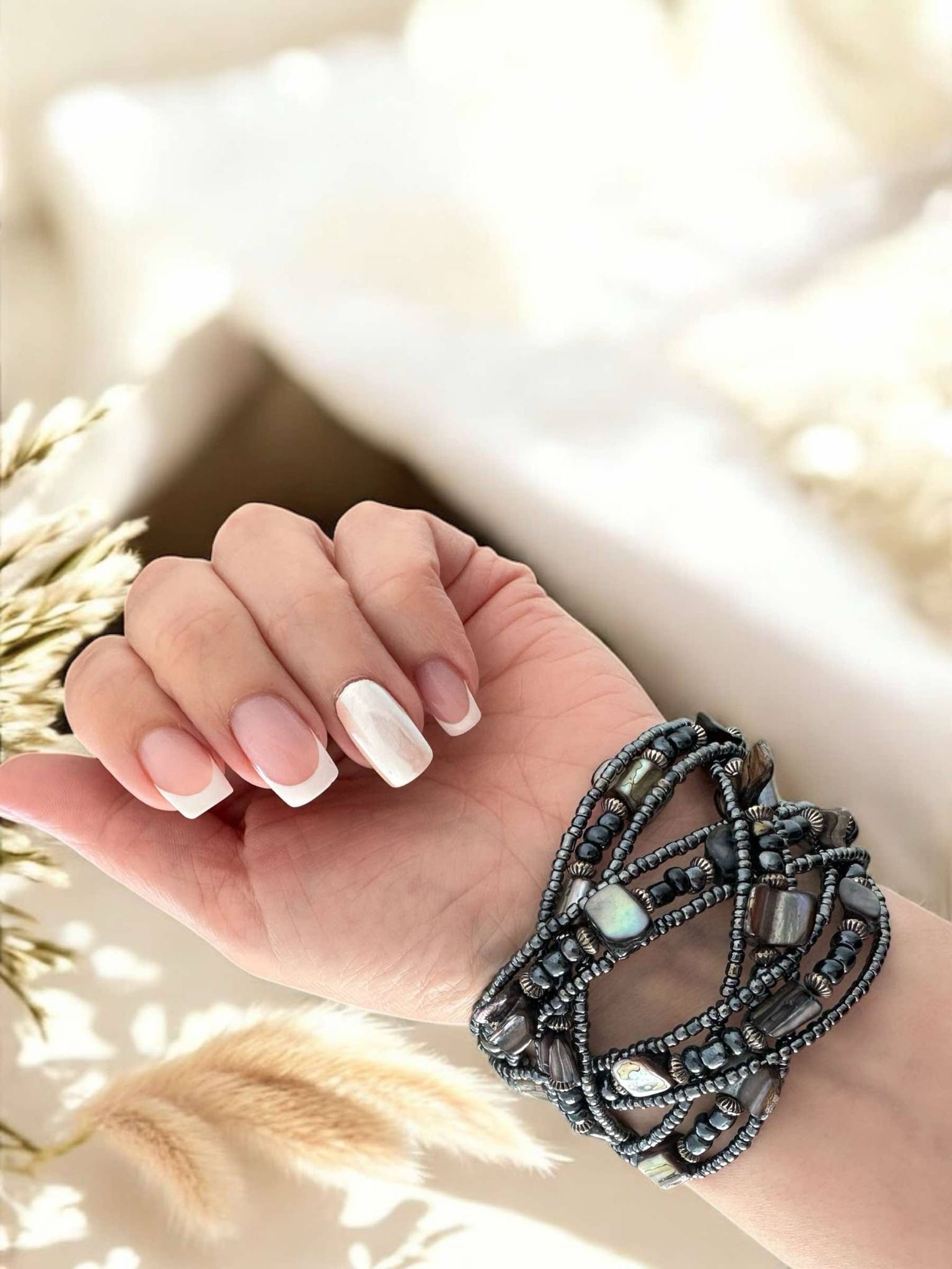 Bracelet extensible en perles naturelles nacrées. Multirangs, élégant, et confortable. Fabriqué à la main.