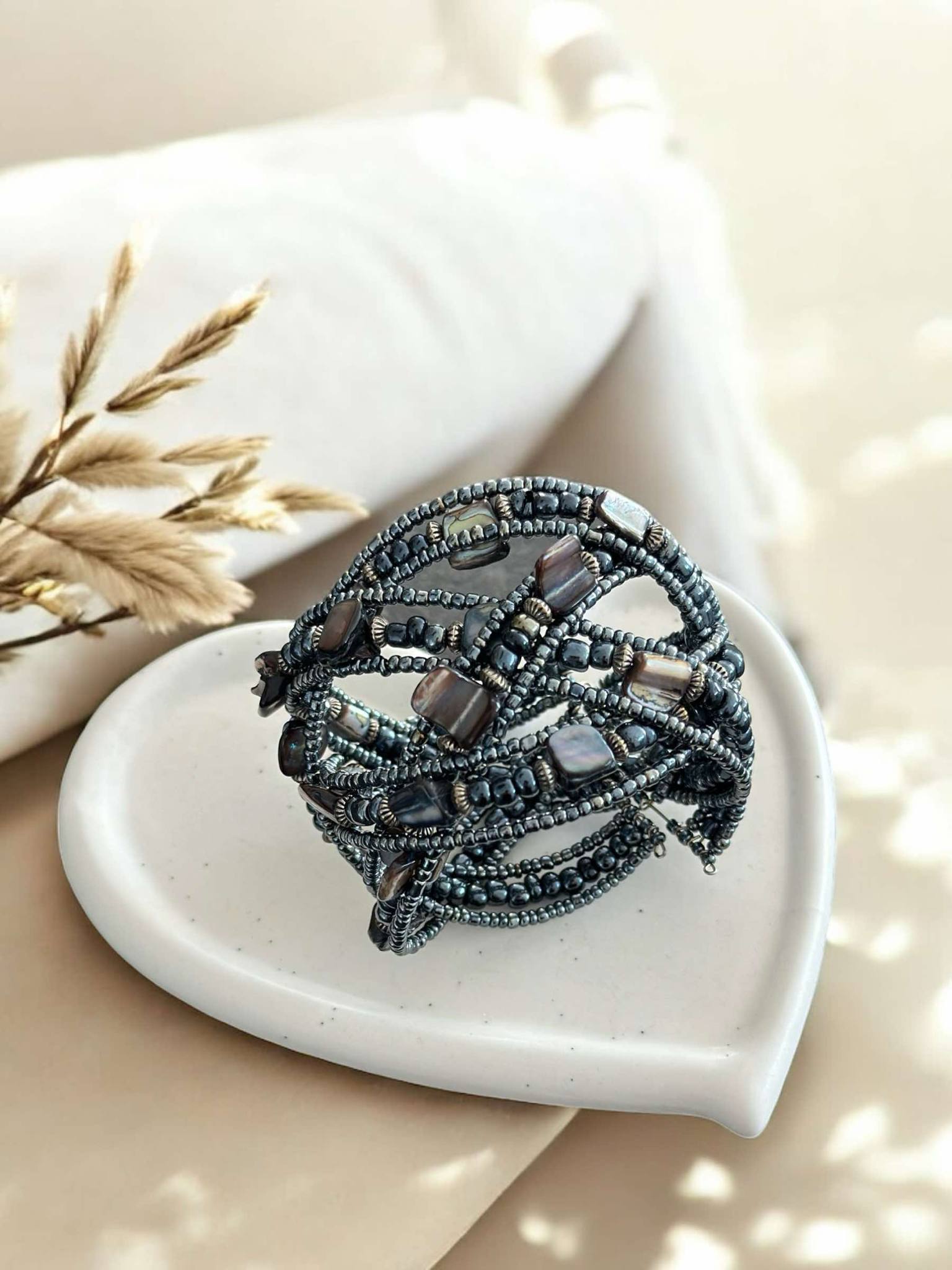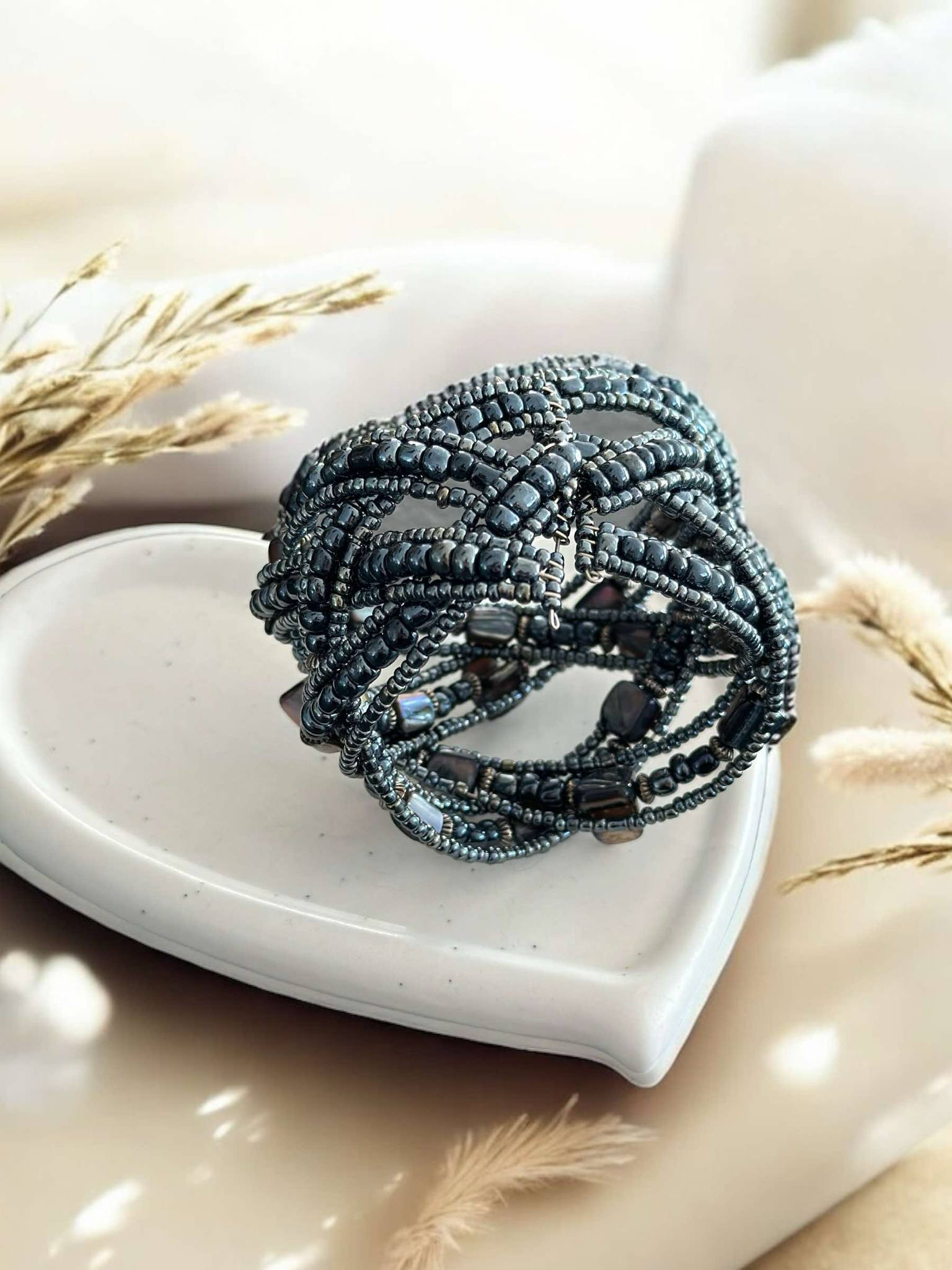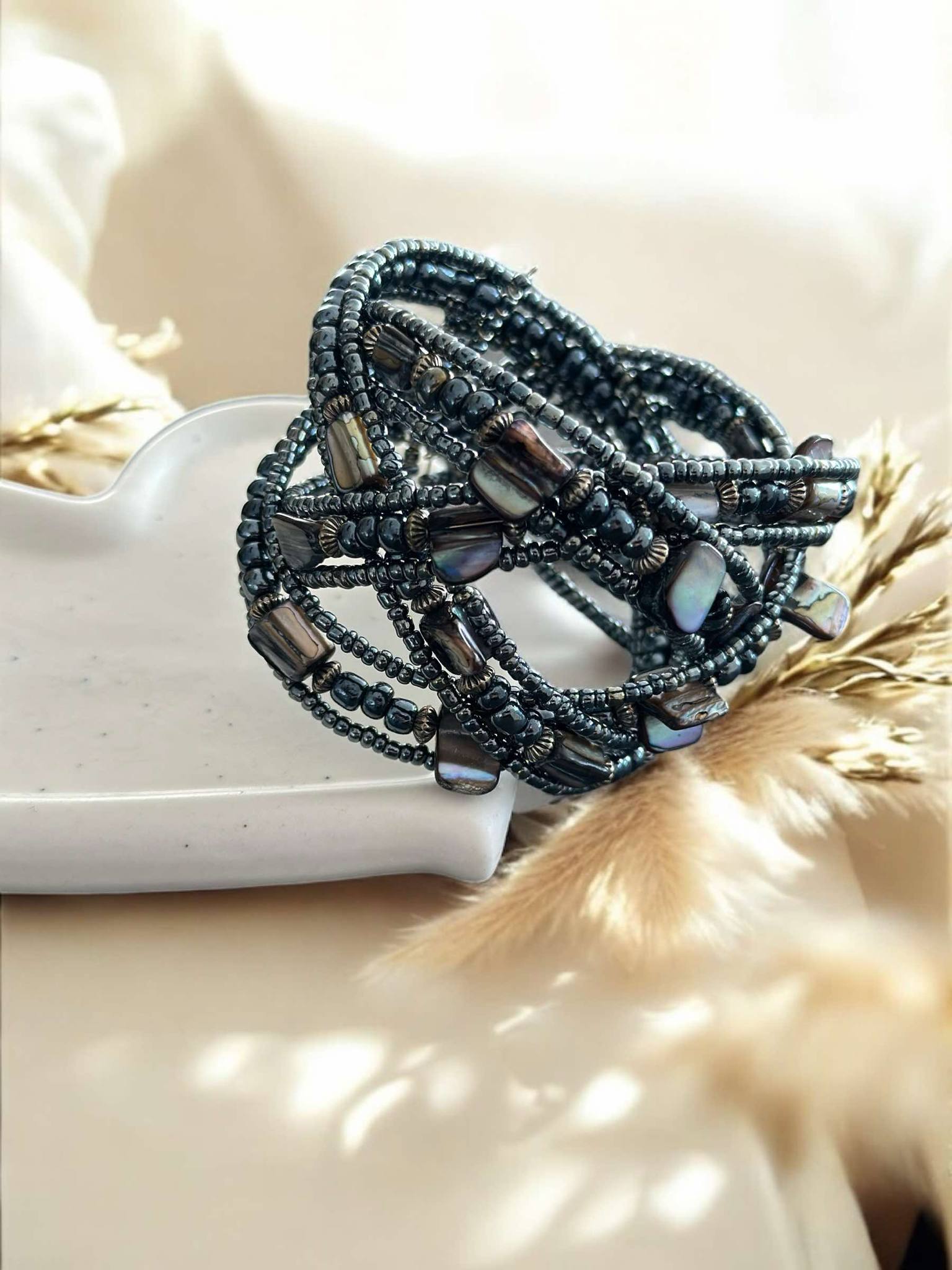 Affirme ton style avec ce bracelet multirangs fait de perles naturelles, aux teintes sombres nacrées et reflets changeants. Chaque perle, unique par sa forme et sa brillance, compose un bijou au design organique et raffiné.