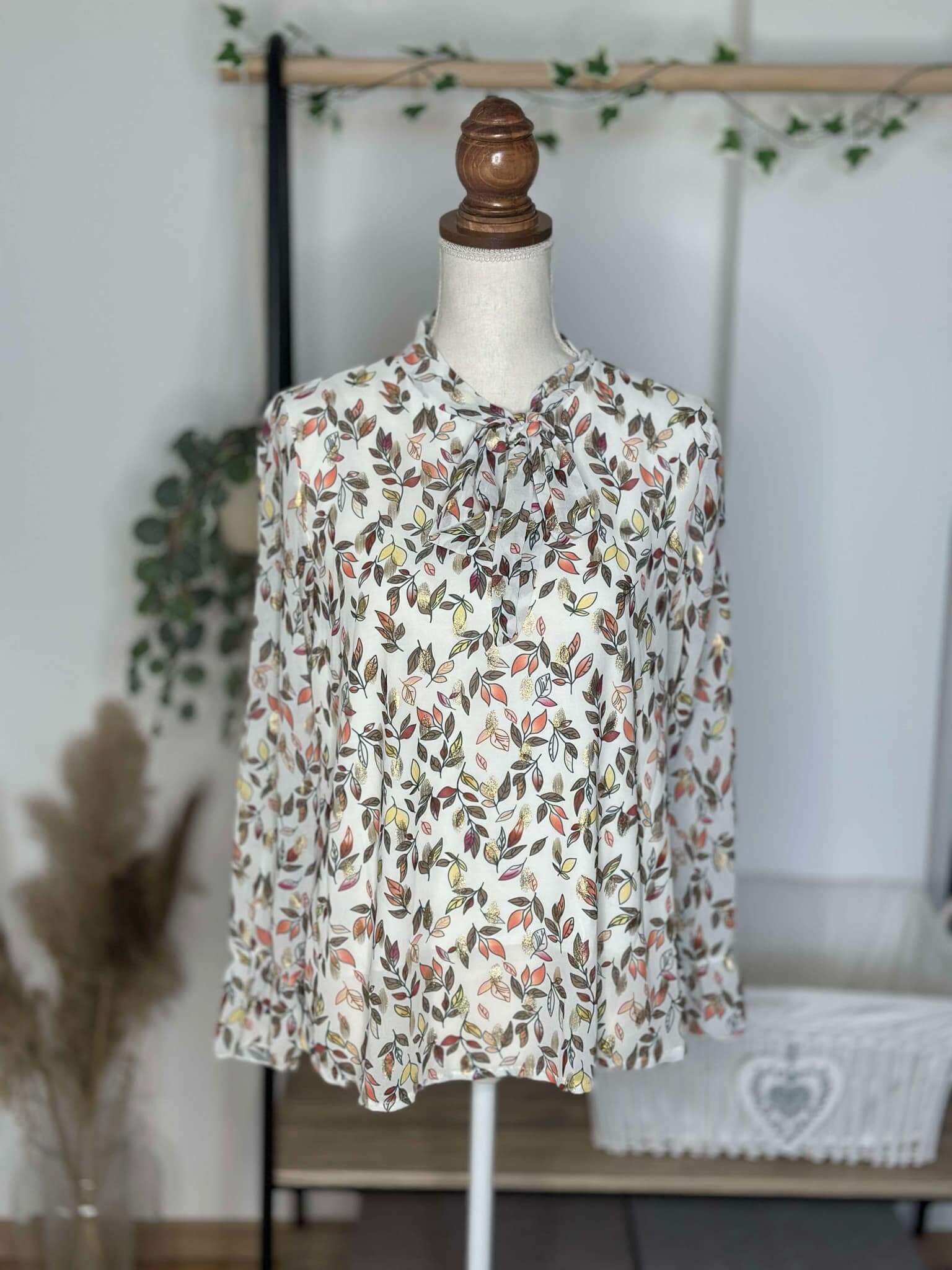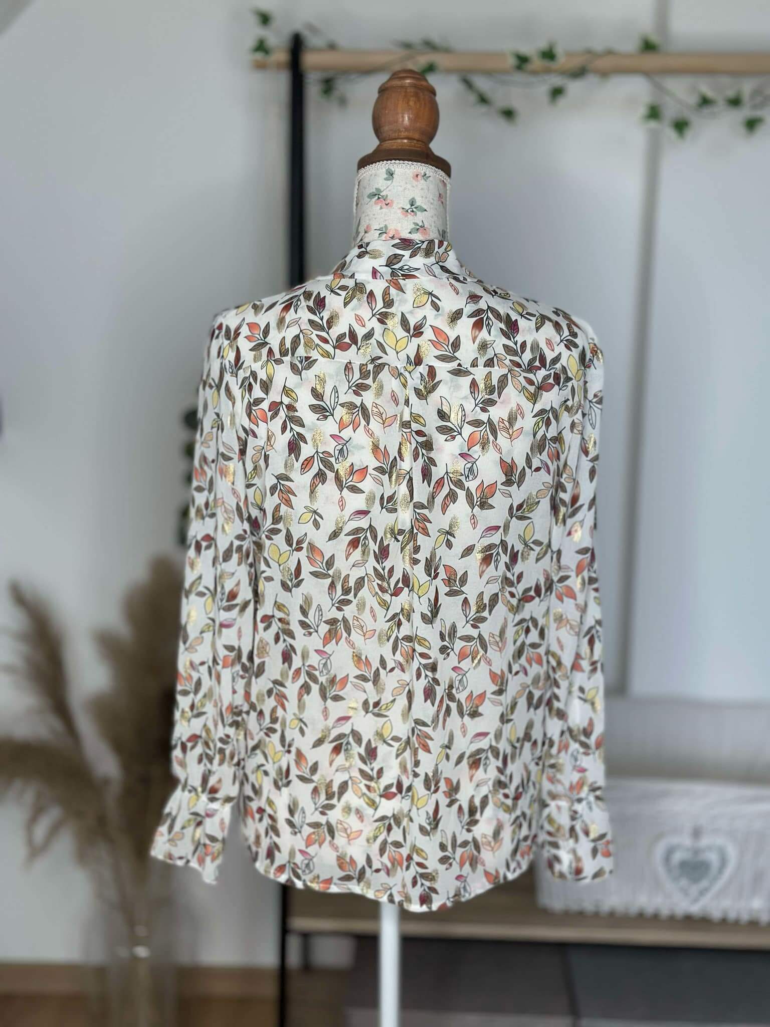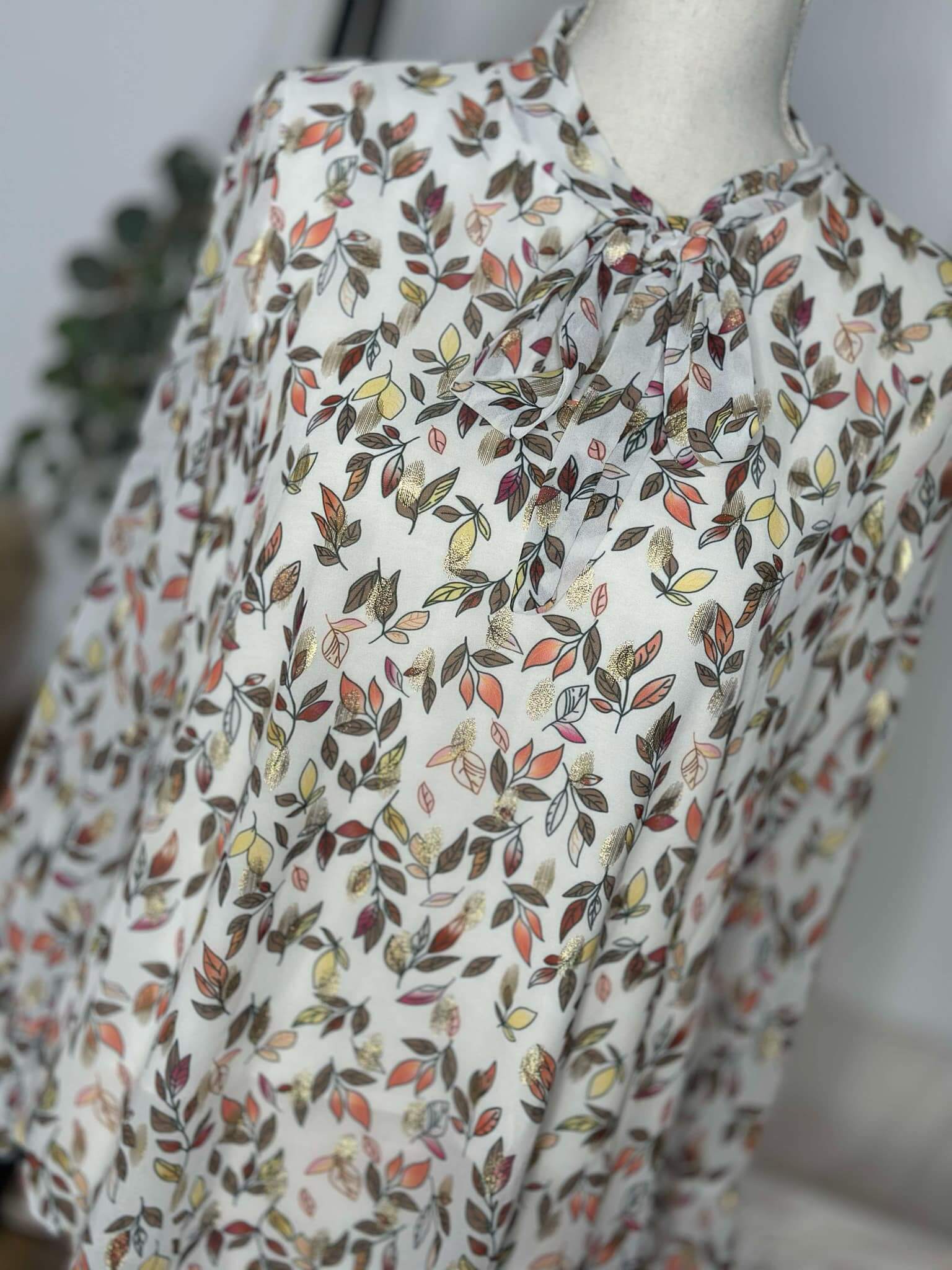 Chemisier fluide blanc orné d’un imprimé feuillage aux touches dorées. Nœud lavallière au col pour une touche élégante et féminine. Parfait pour le bureau ou une tenue chic du quotidien.