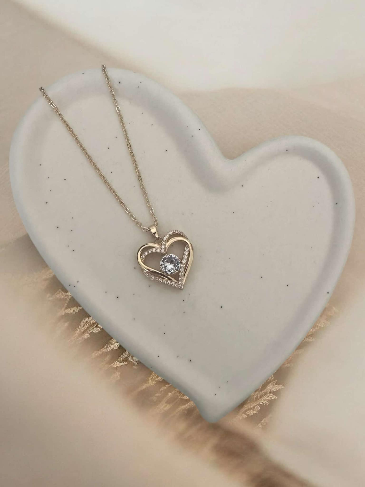 Un collier raffiné au design romantique, composé d’un pendentif double cœur doré orné de strass et d’une pierre centrale. Fabrication artisanale signée La beauté en un clic.