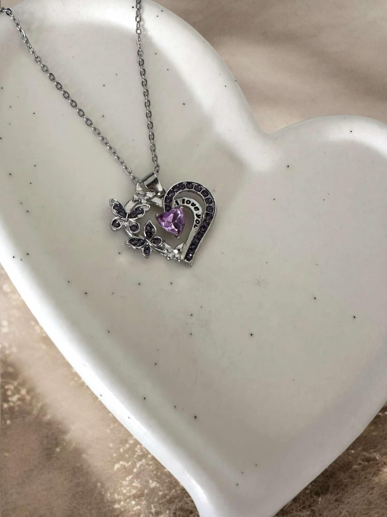 Ce collier délicat en acier inoxydable capture l’élégance et la tendresse. Son pendentif en forme de cœur, avec son inscription « I Love You » , finement travaillé, est orné de strass scintillants et de trois petits papillons en relief, tous incrustés de cristaux. En son centre, une pierre violette en forme de cœur apporte une touche lumineuse et romantique.