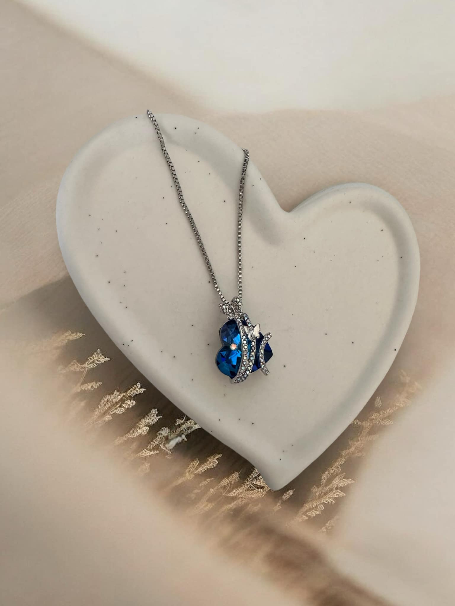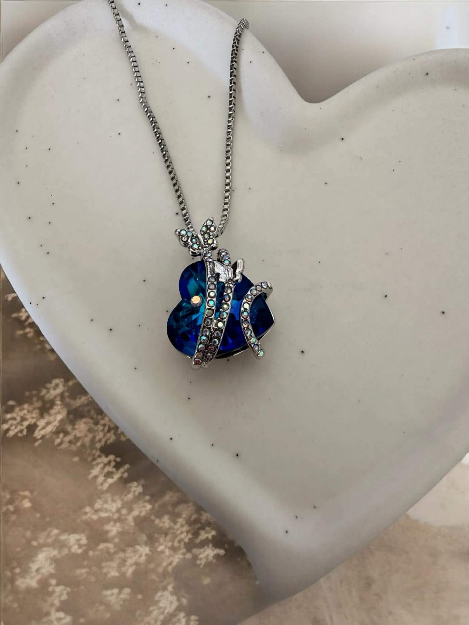 Un collier raffiné et poétique avec pendentif cœur bleu aux reflets holographiques, orné de strass et d’un délicat papillon. Création artisanale signée La beauté en un clic.
