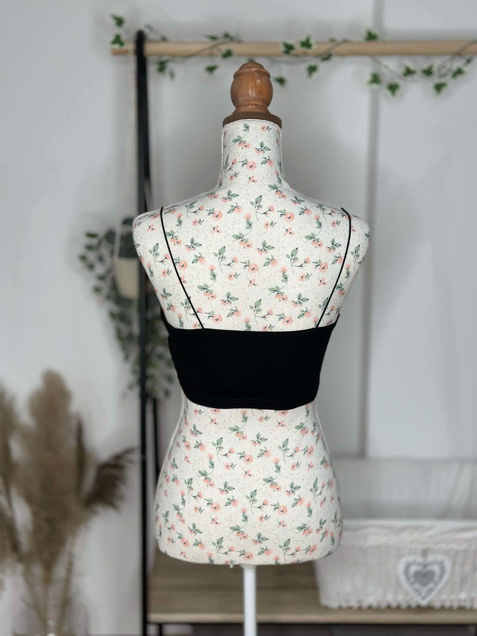 Crop top noir à fines bretelles au style minimaliste. Tissu stretch, coupe ajustée et confort absolu pour des looks casual ou habillés.