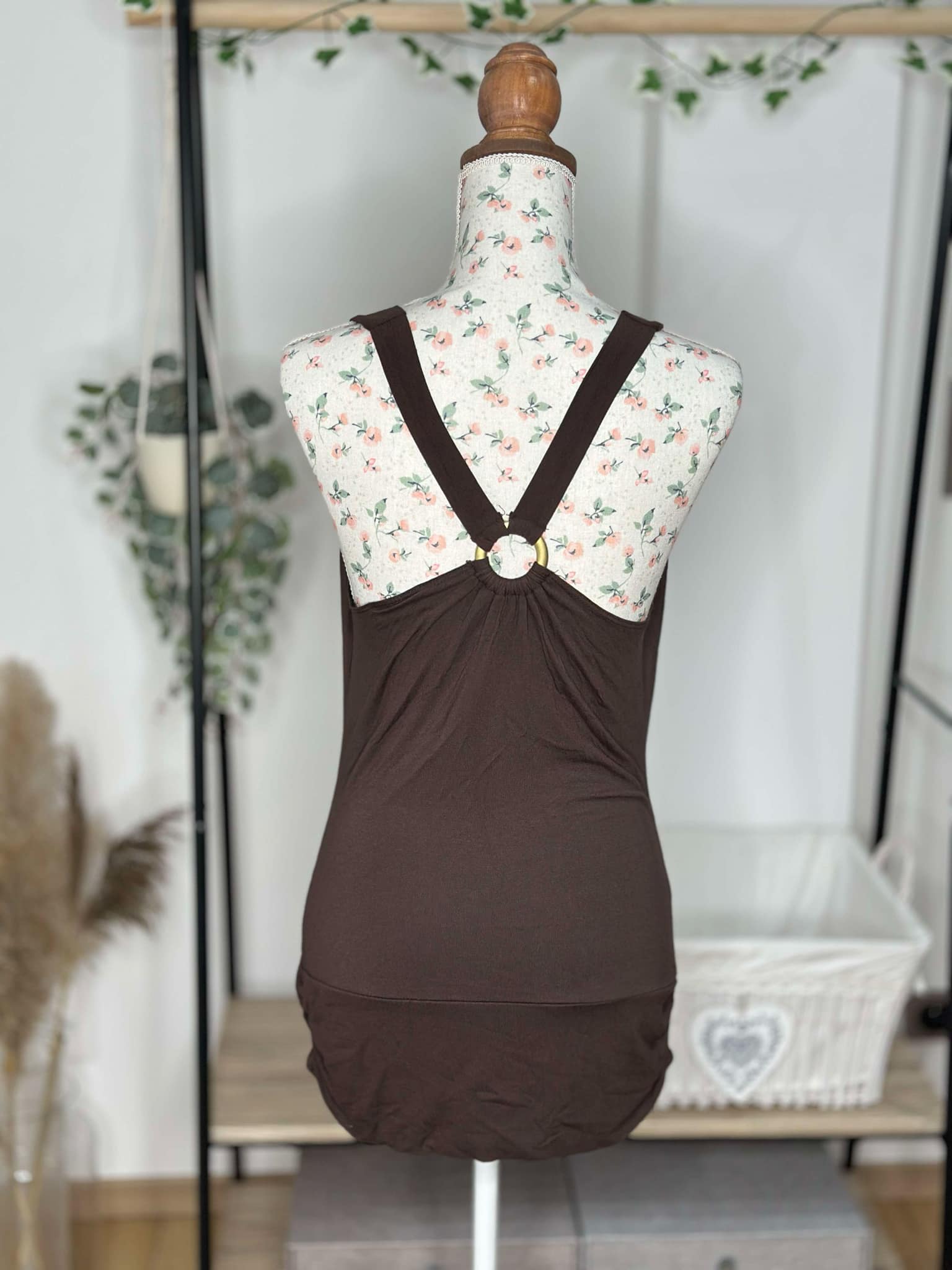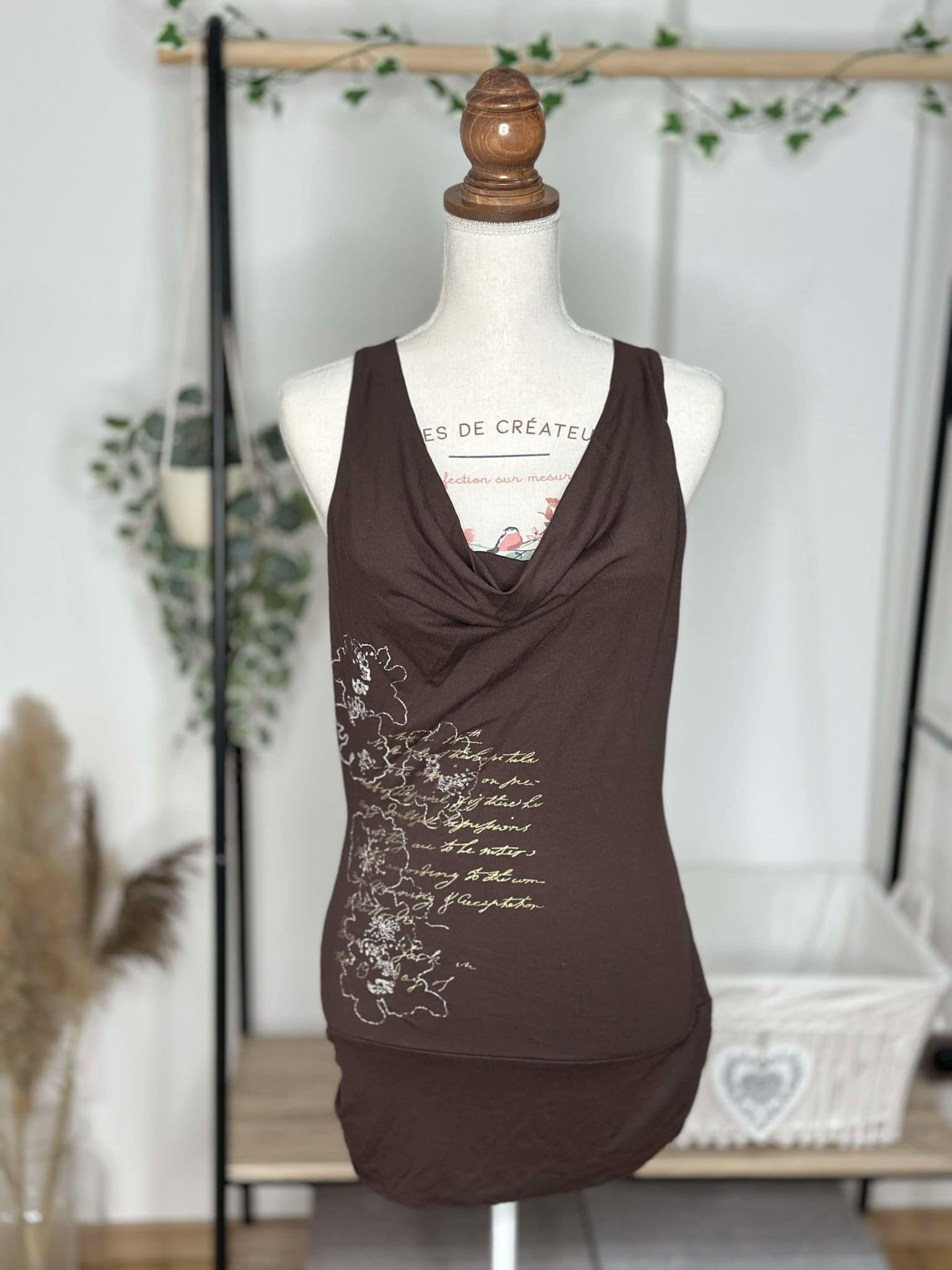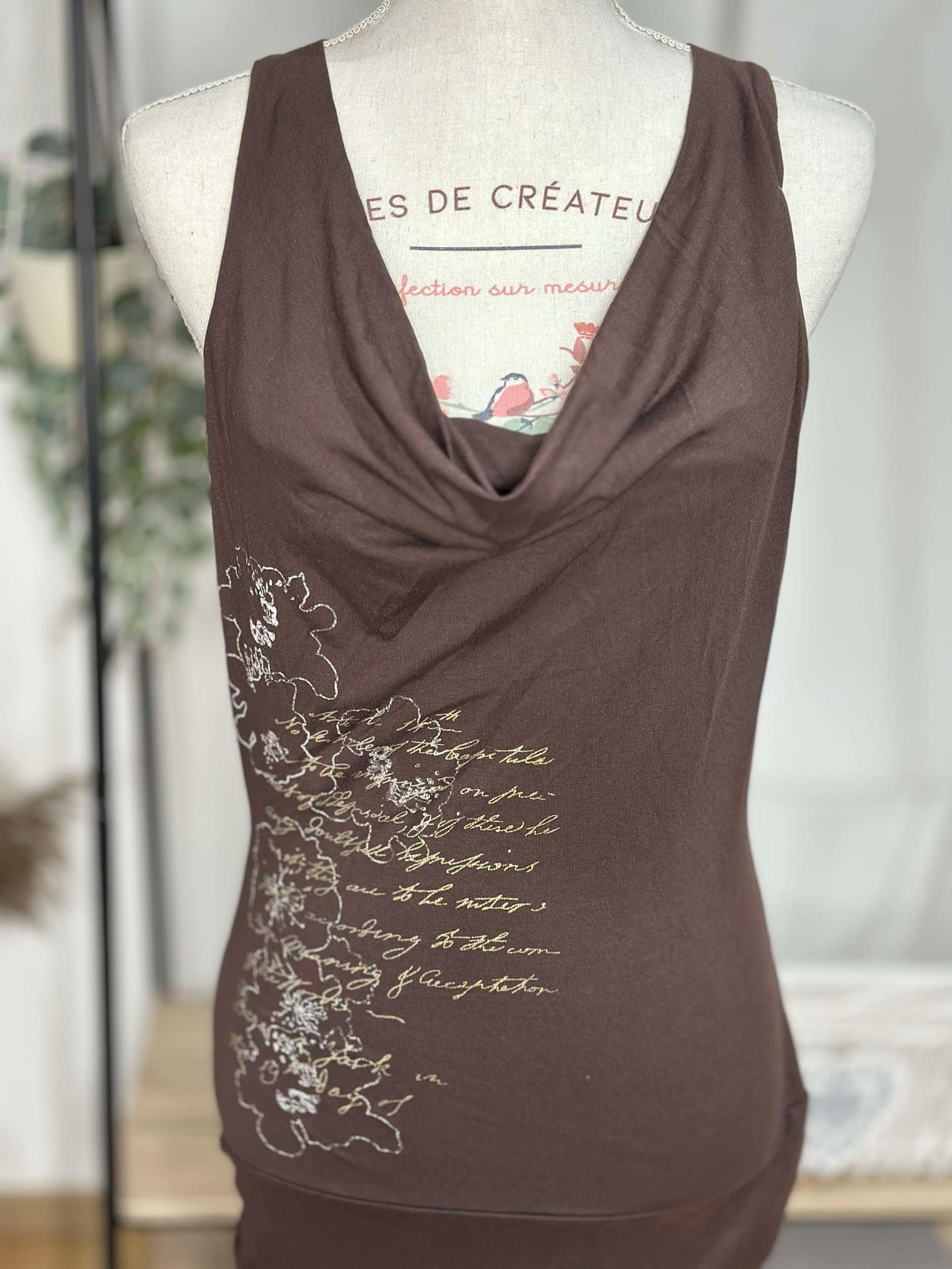 Débardeur marron à coupe ajustée avec écriture dorée, décolleté drapé et détail anneau au dos. Style casual chic et confort garanti.