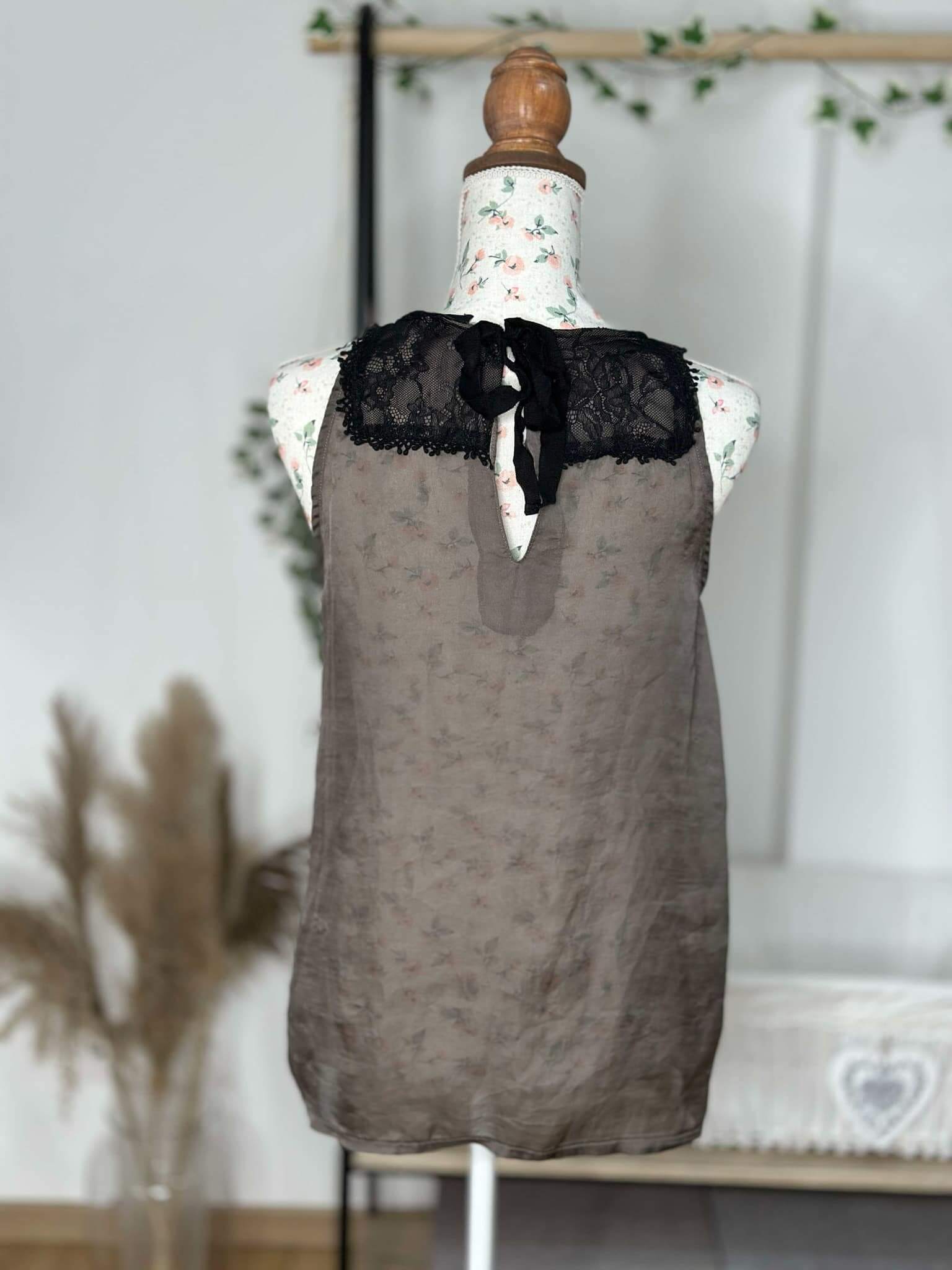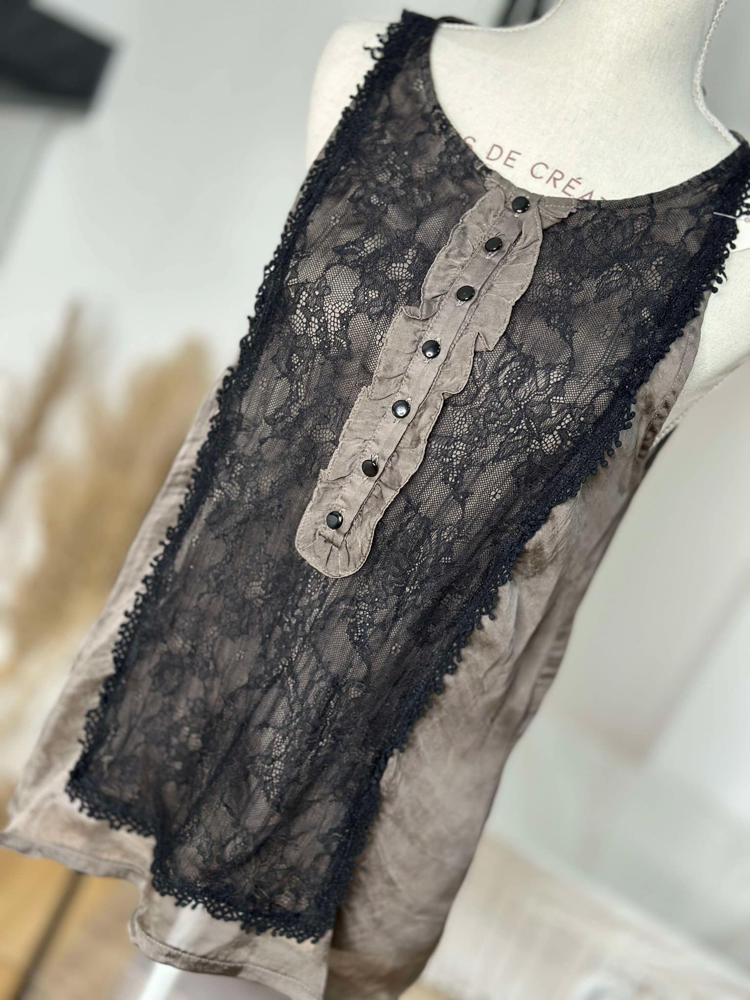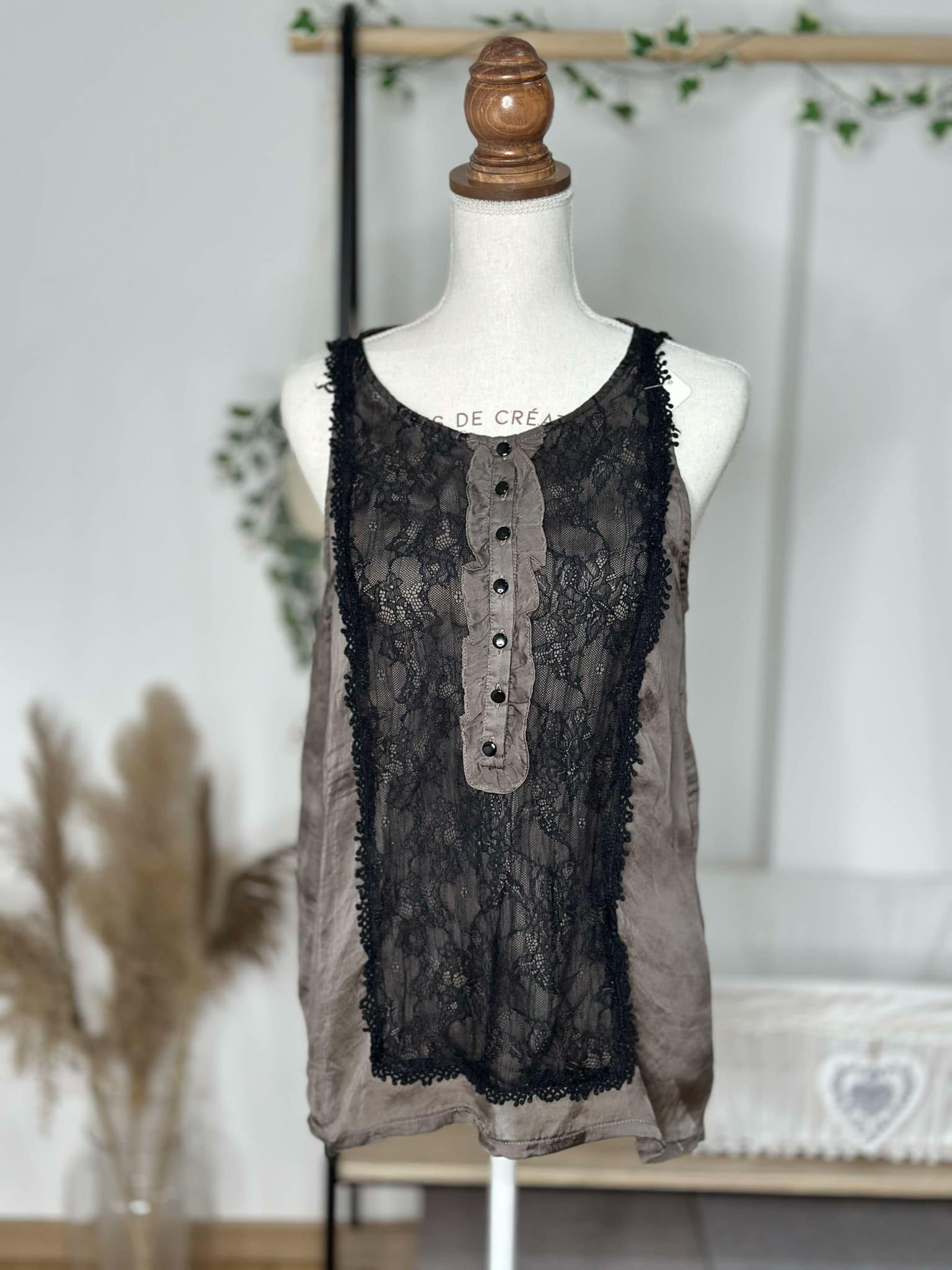 Laisse toi séduire par l’élégance romantique de ce débardeur marron au style fluide et raffiné. Conçu dans une matière douce et agréable, ce haut met en valeur un délicat empiècement de dentelle noire sur le devant, agrémenté de petits boutons décoratifs pour une touche vintage.