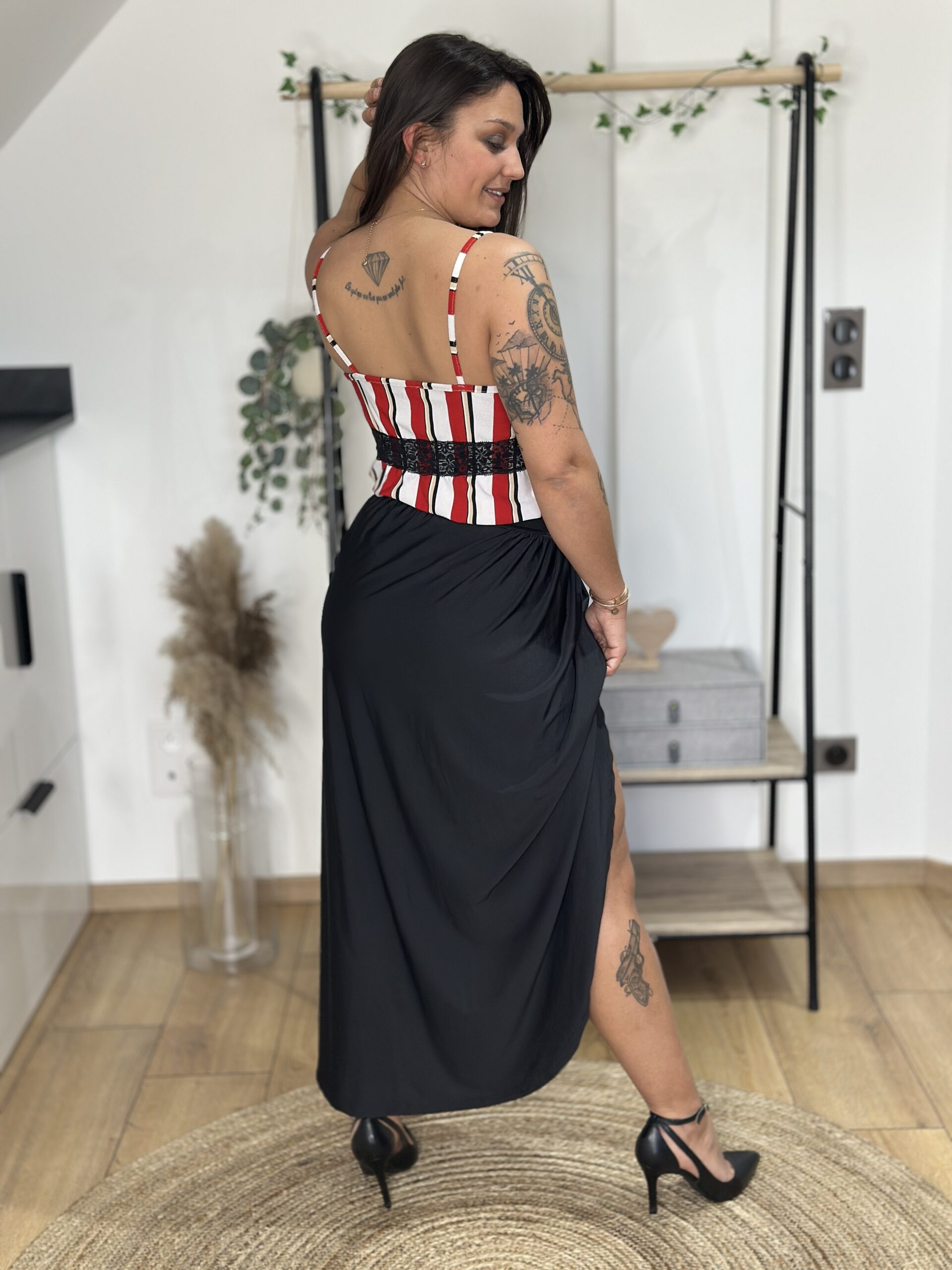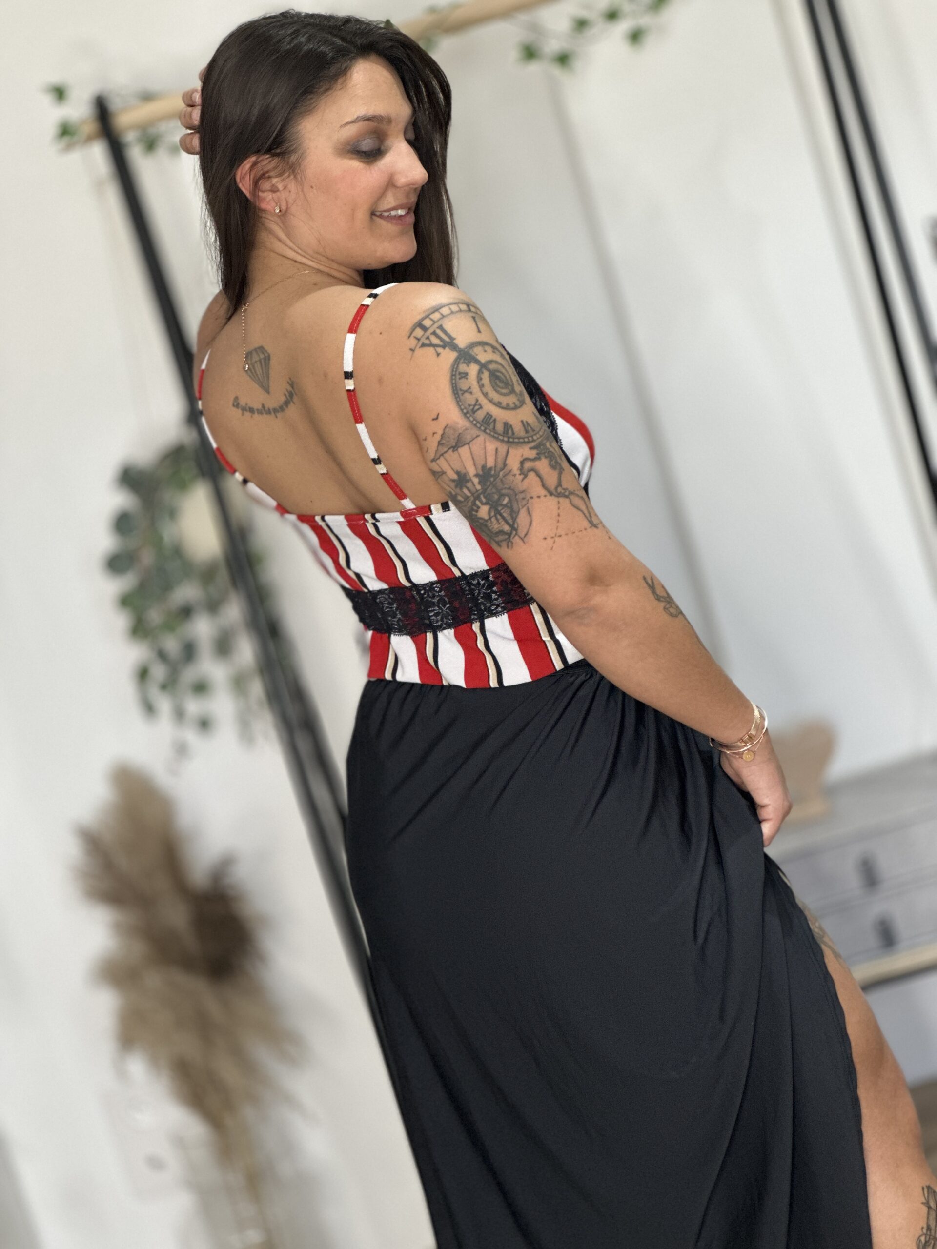 Le contraste des rayures rouges, blanches et noires met en valeur ton allure, tandis que la dentelle noire au niveau du buste et de la taille apporte une note de féminité raffinée. C’est un haut parfait pour une soirée estivale, une sortie entre amis ou à glisser sous une veste pour un effet chic décontracté.