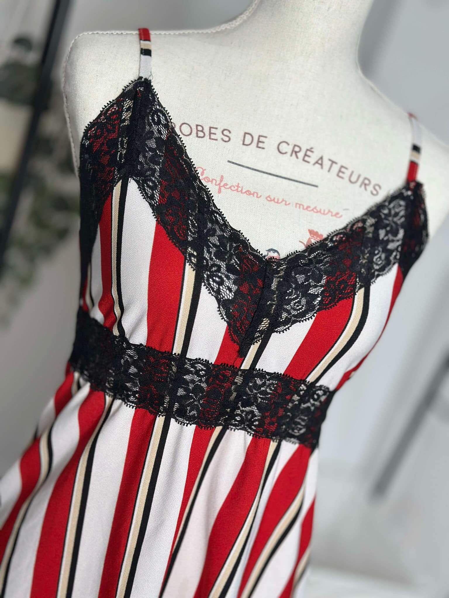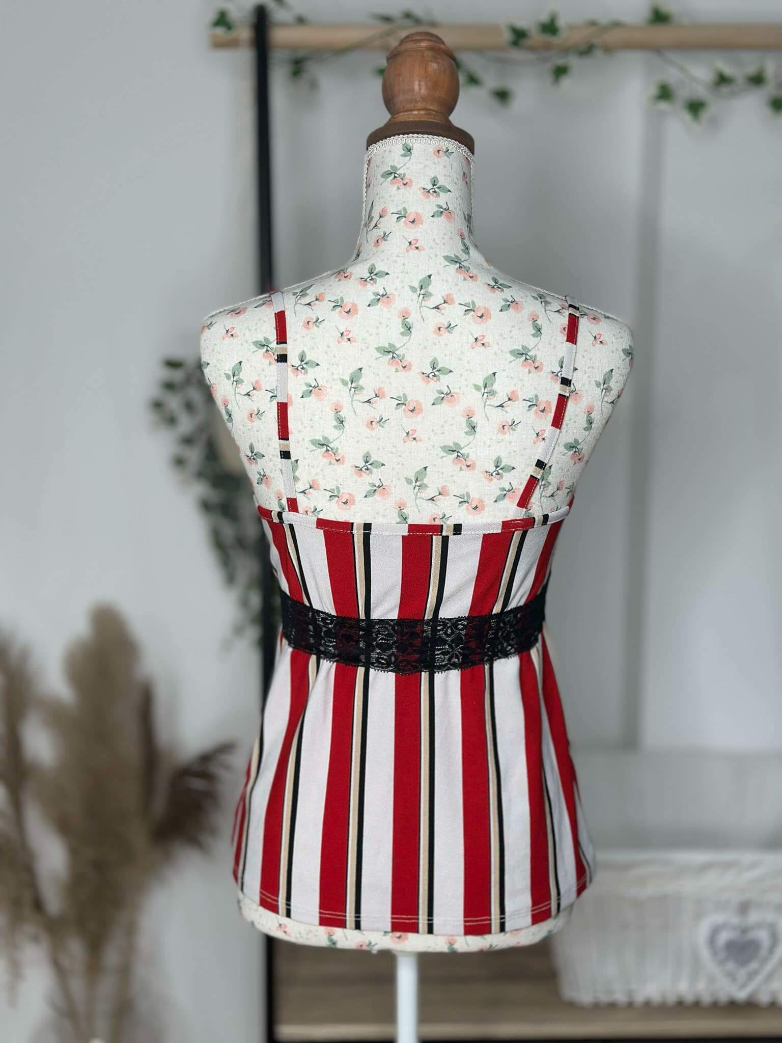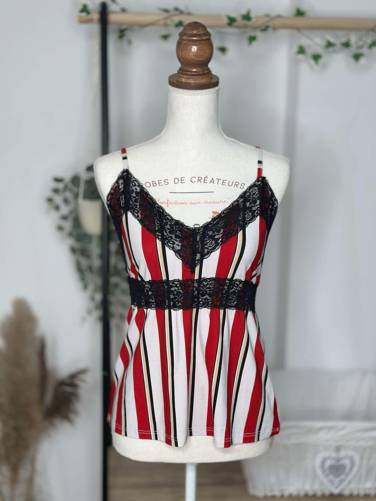 Débardeur à rayures verticales rouges, blanches et noires avec détails en dentelle noire. Bretelles fines, coupe ajustée. Parfait pour un look chic et audacieux.