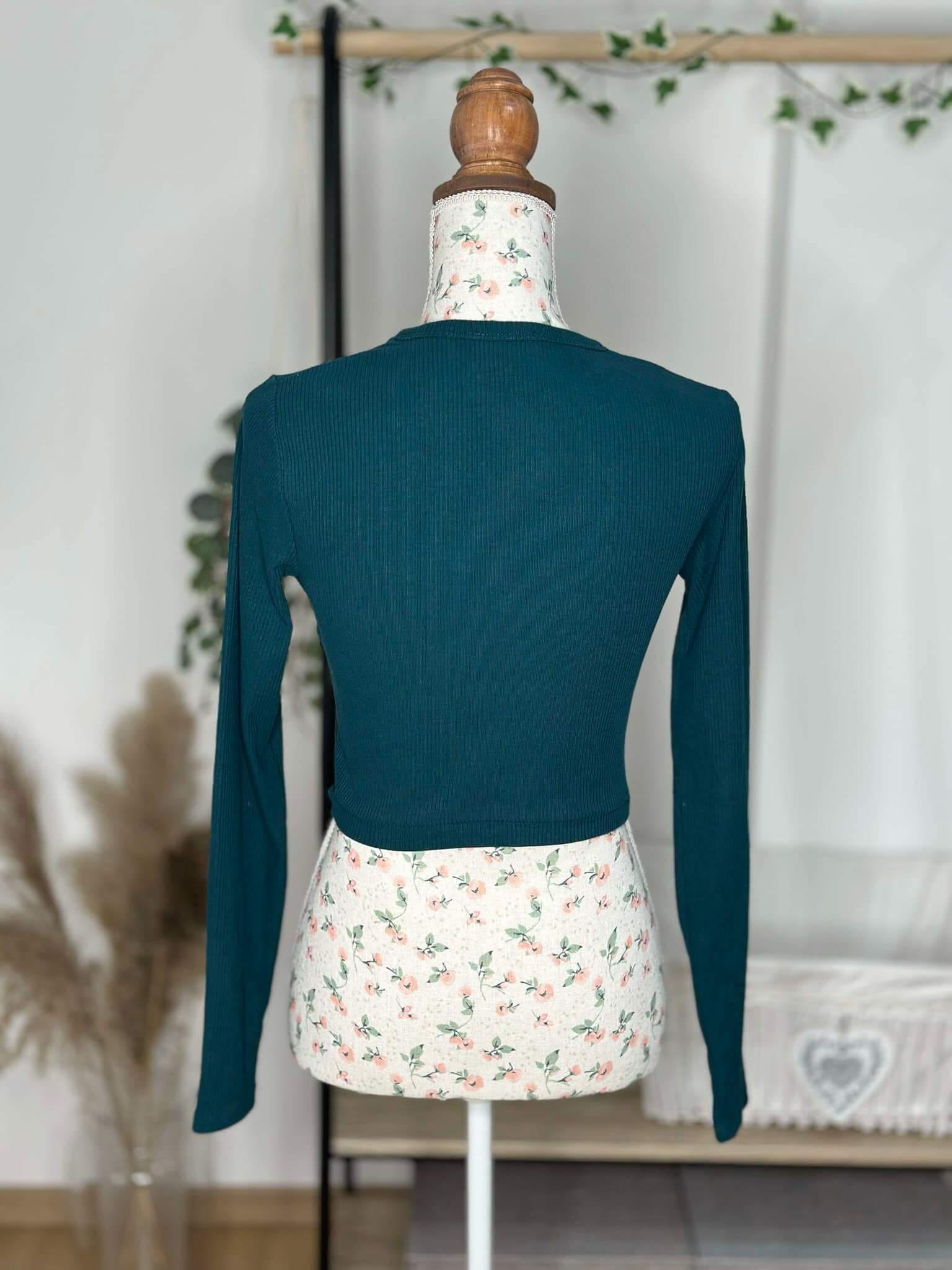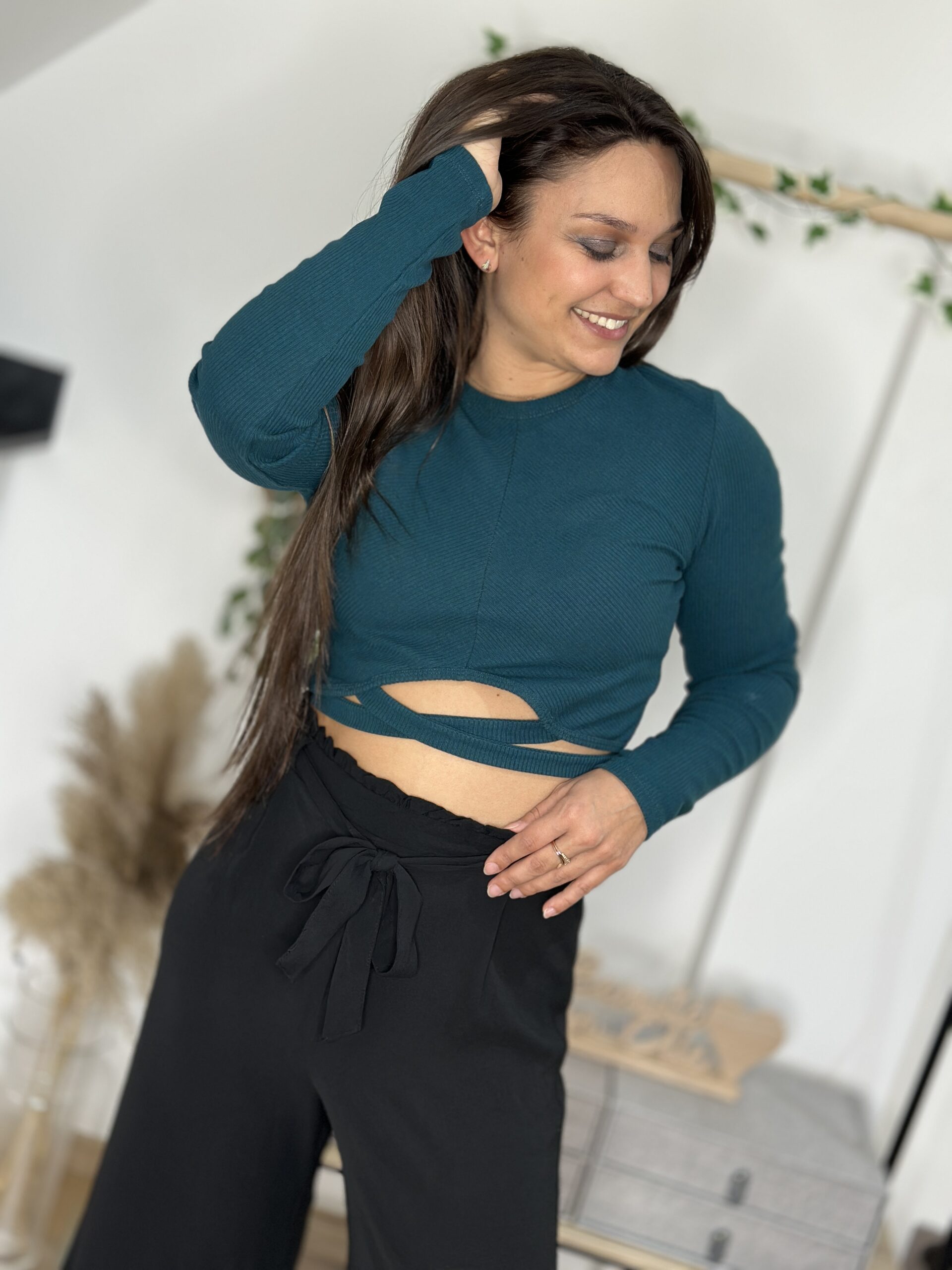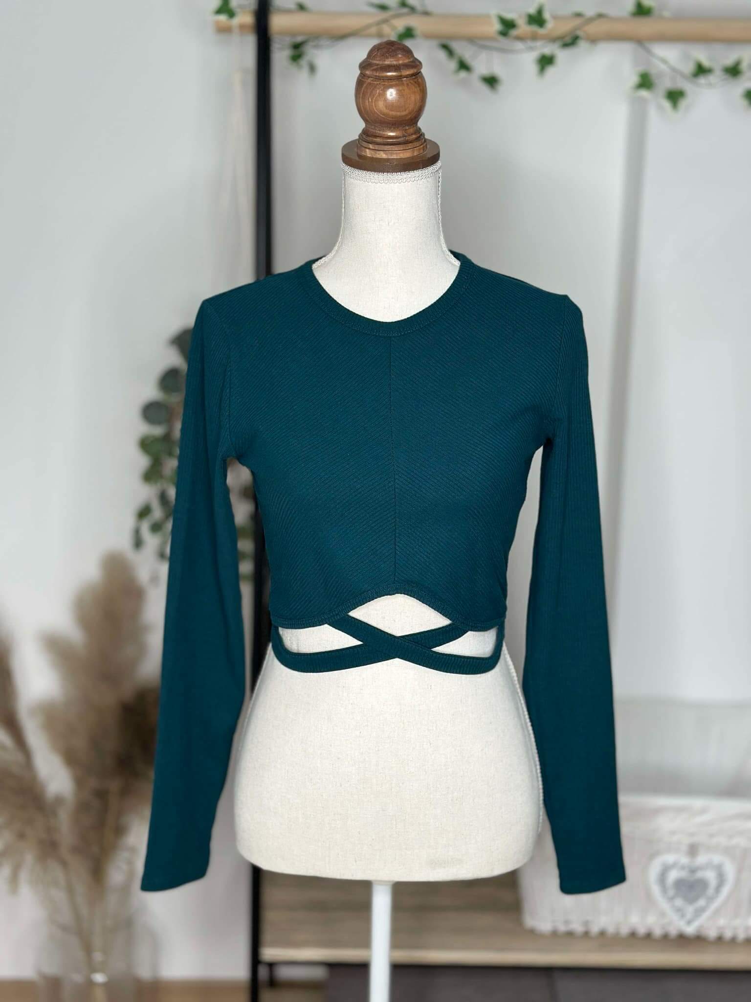 Haut court bleu canard à manches longues, coupe ajustée avec découpe croisée. Tissu côtelé extensible et détail stylé pour un look tendance.