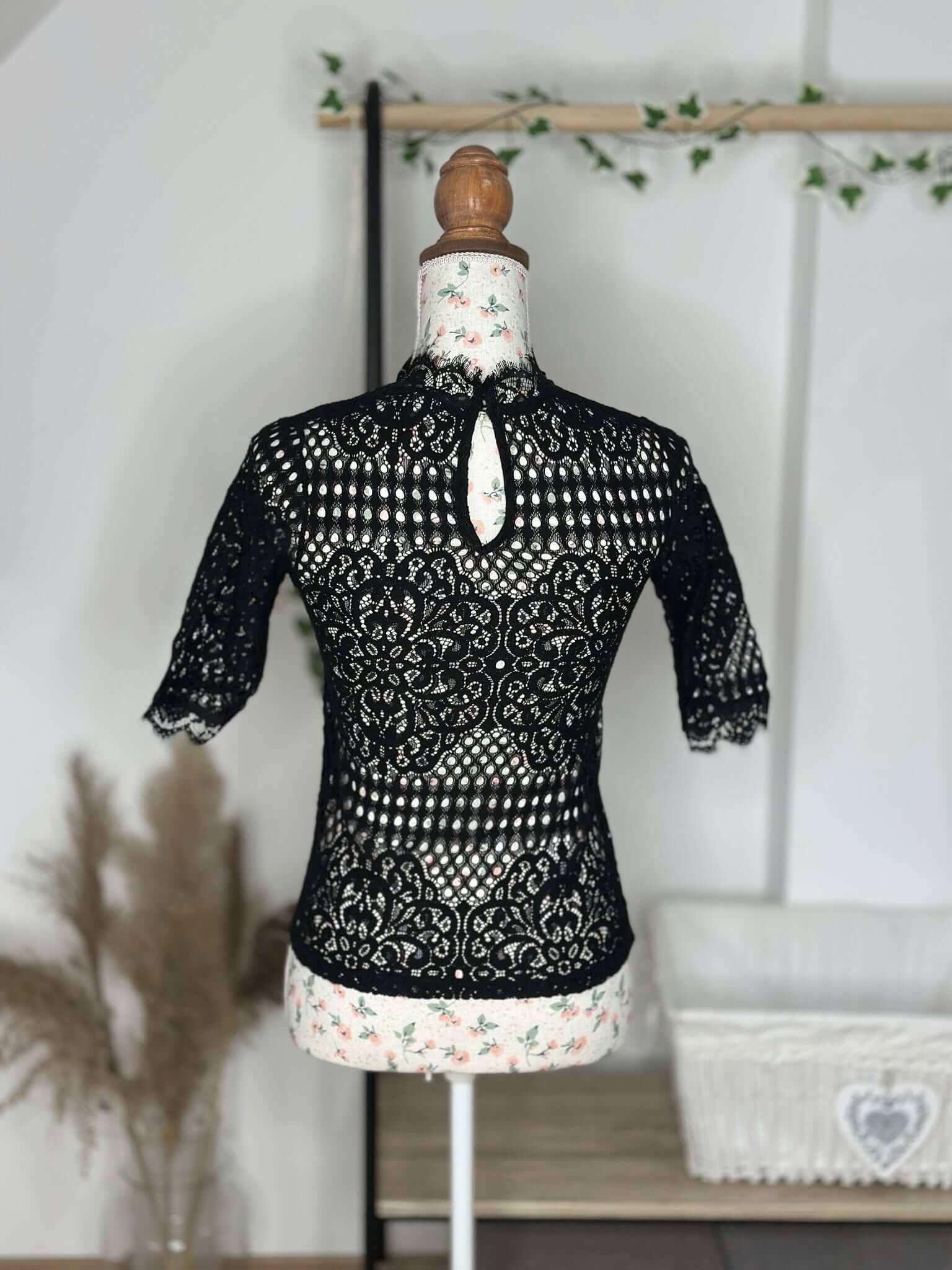 Haut raffiné en dentelle crochetée noire avec col montant et manches mi-longues. Élégance et modernité pour un look chic et féminin.