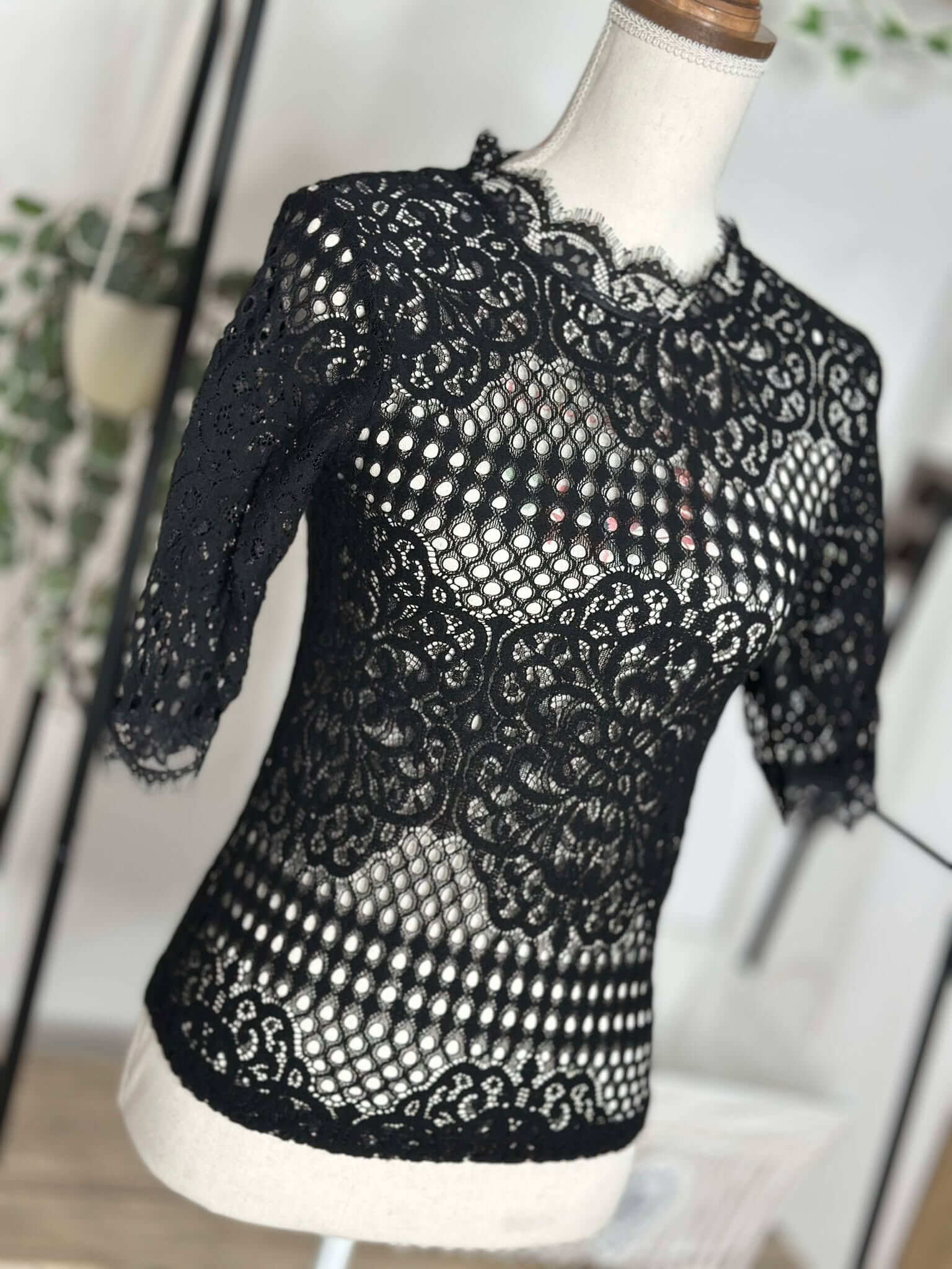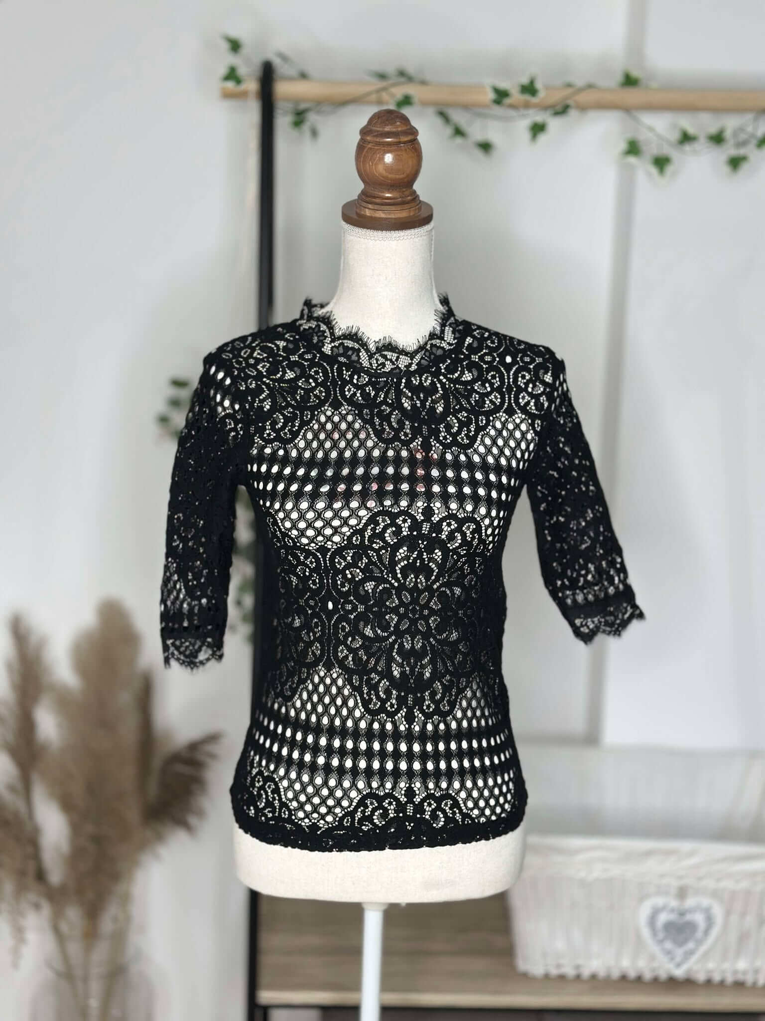 Ce haut noir en dentelle crochetée est une véritable pièce maîtresse pour une tenue élégante et sophistiquée. Son col montant délicatement festonné ajoute une touche romantique tandis que les manches mi-longues offrent une allure raffinée.