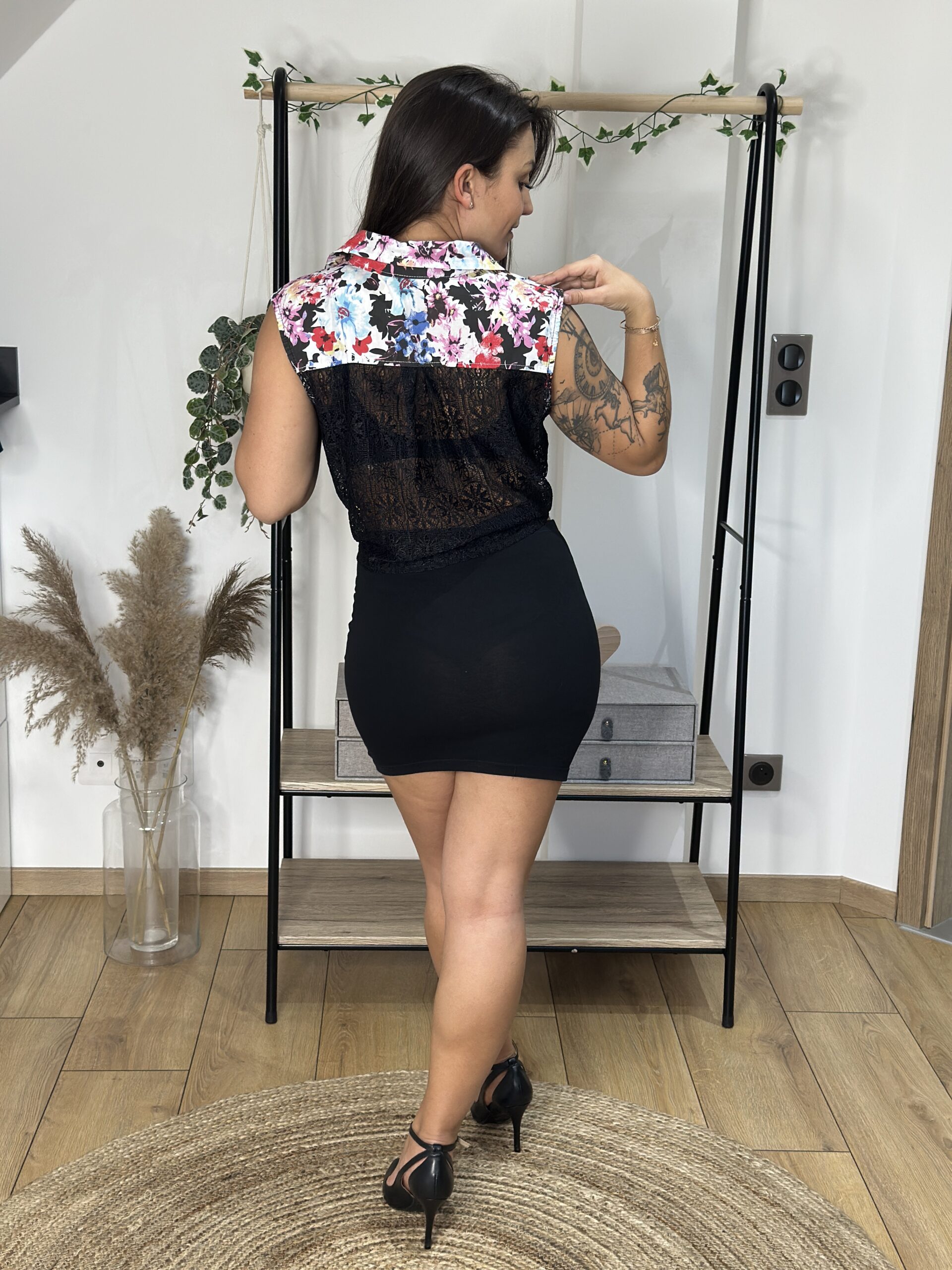 Haut sans manches fleuri et dentelle noire
