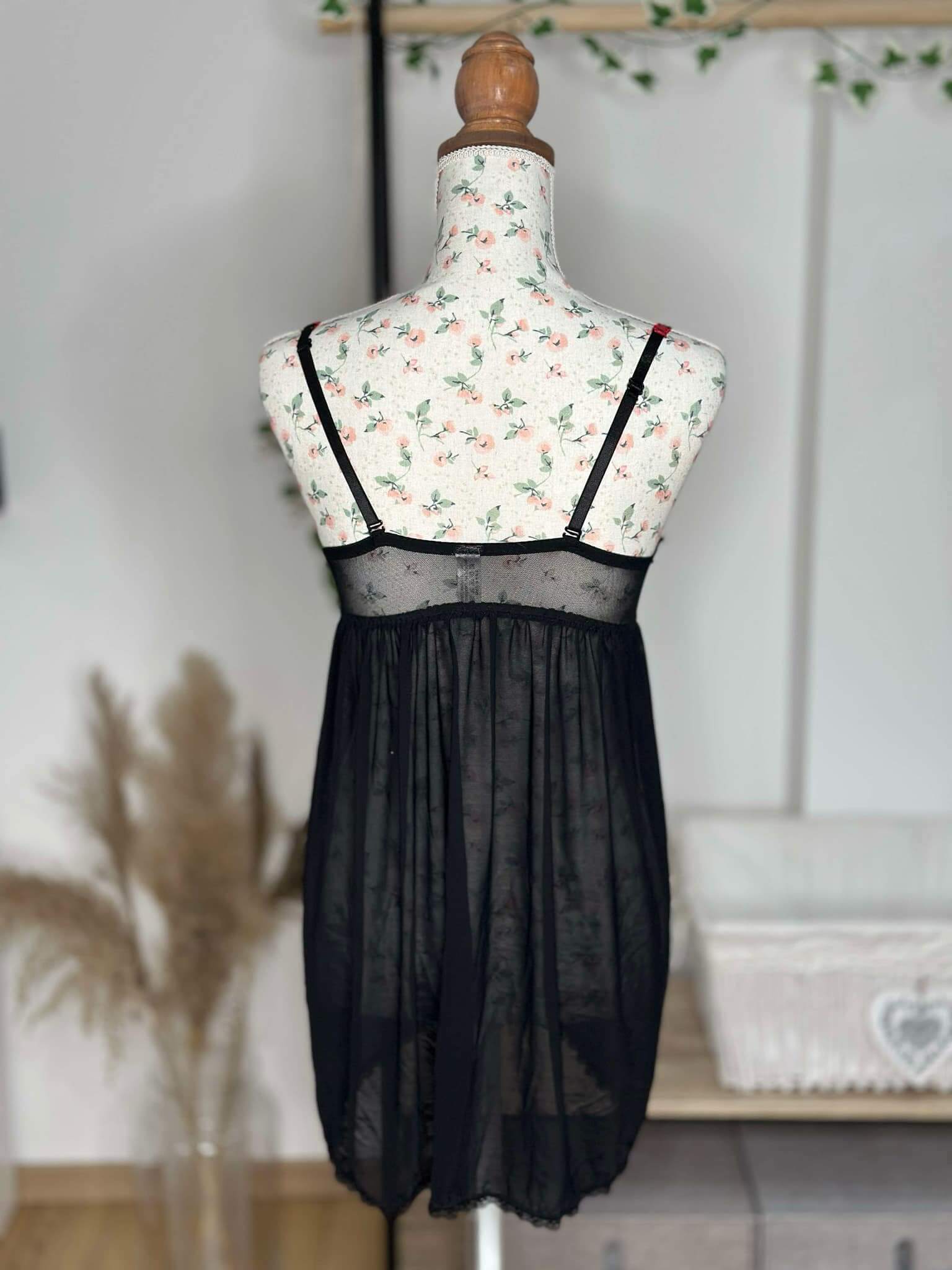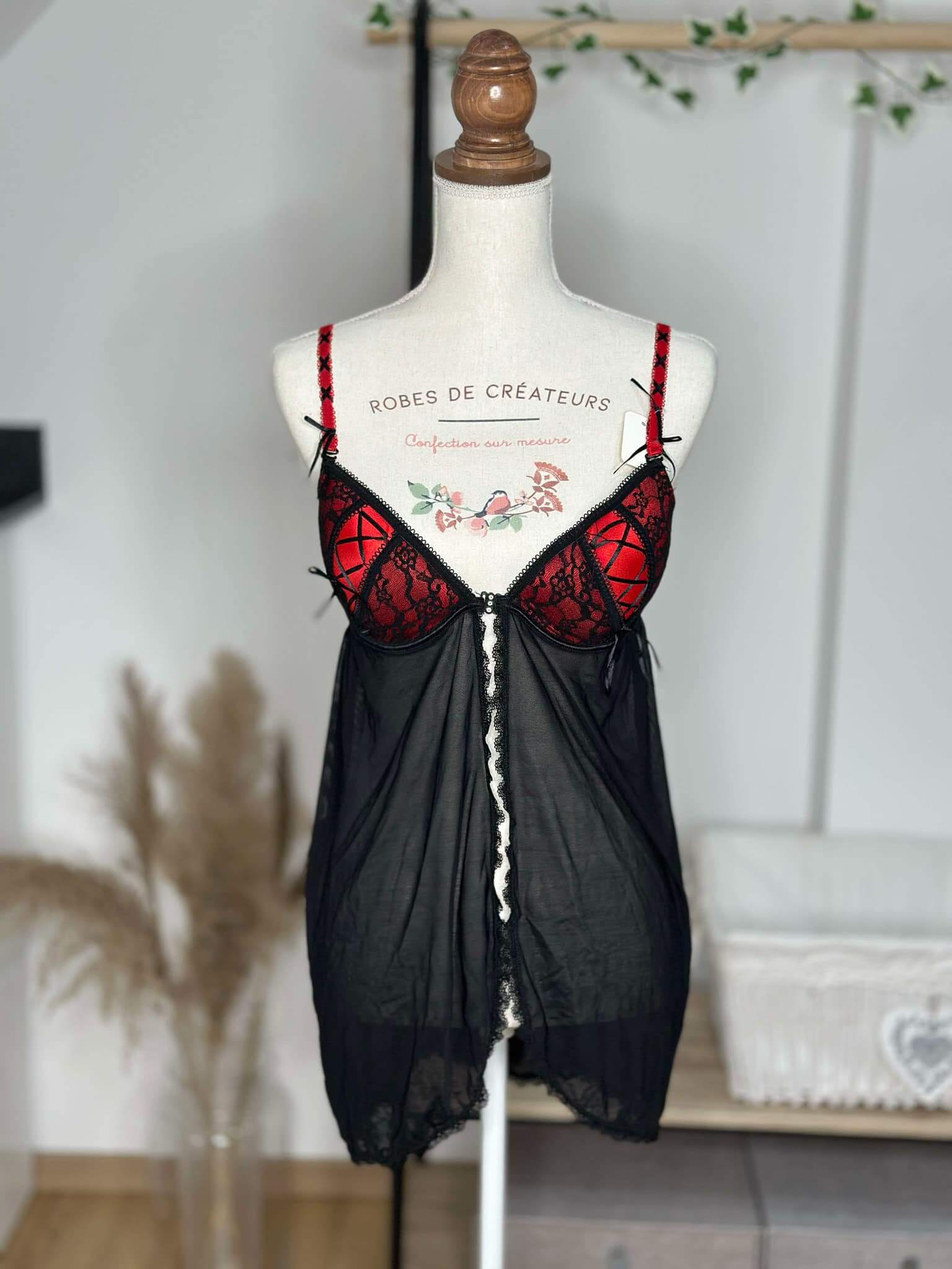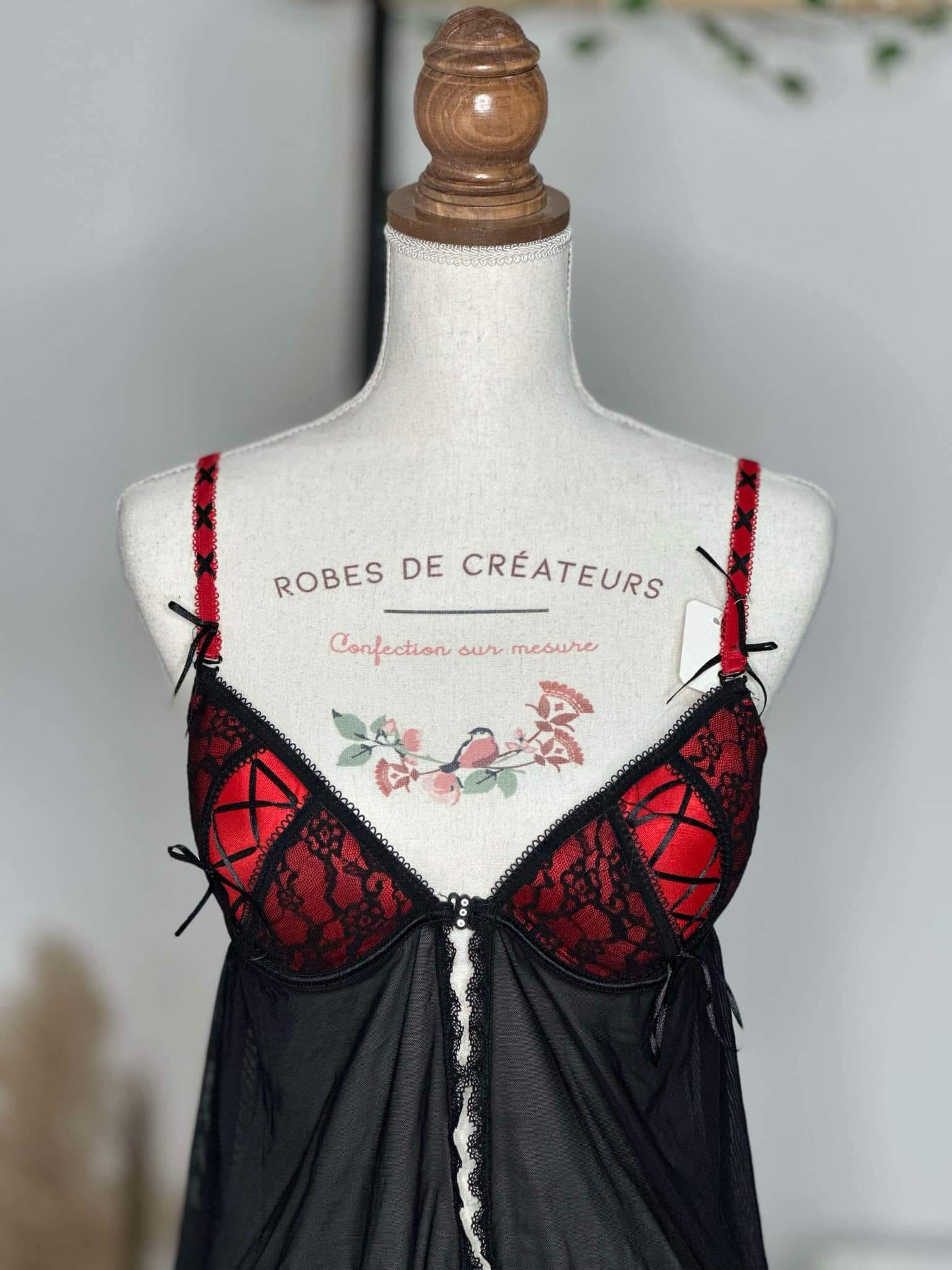 Nuisette noire transparente avec bonnets rouges en dentelle, détails lacés et bretelles réglables. Un modèle sensuel et raffiné pour vos soirées spéciales.