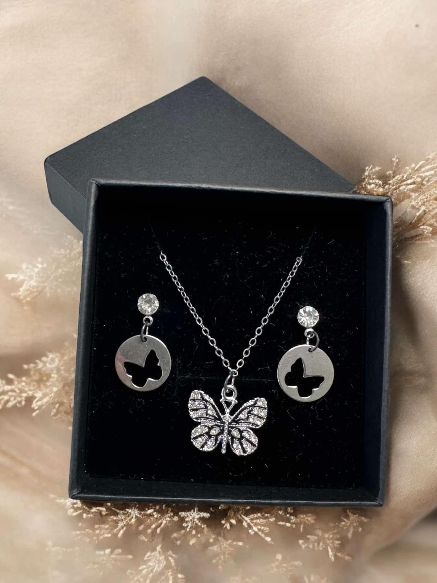 Cette parure incarne la légèreté et la beauté de la nature. Elle se compose d’un collier délicat orné d’un papillon scintillant serti de strass, accompagné d’une paire de boucles d’oreilles cerclées avec motif papillon ajouré et pierre brillante.
