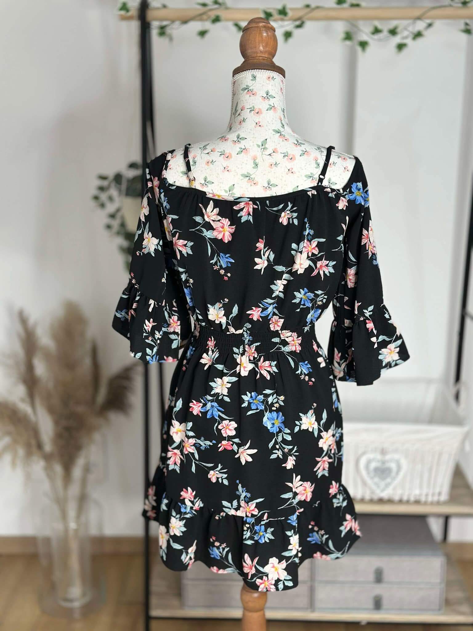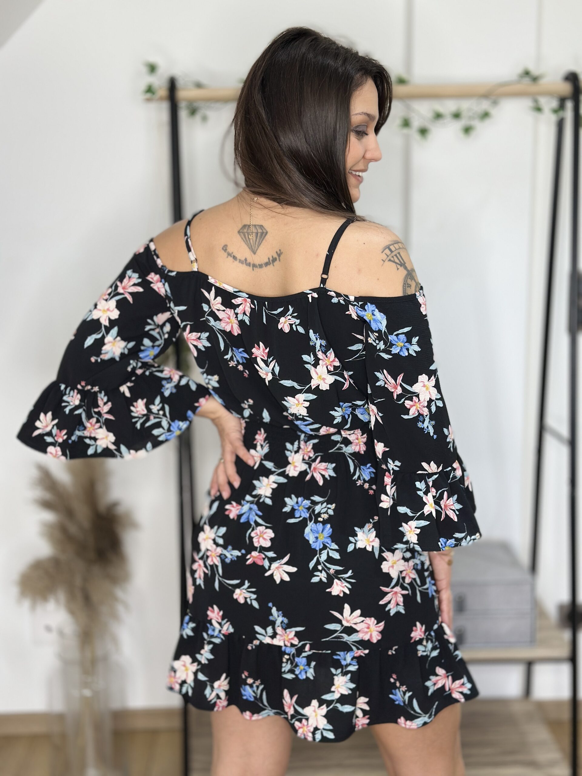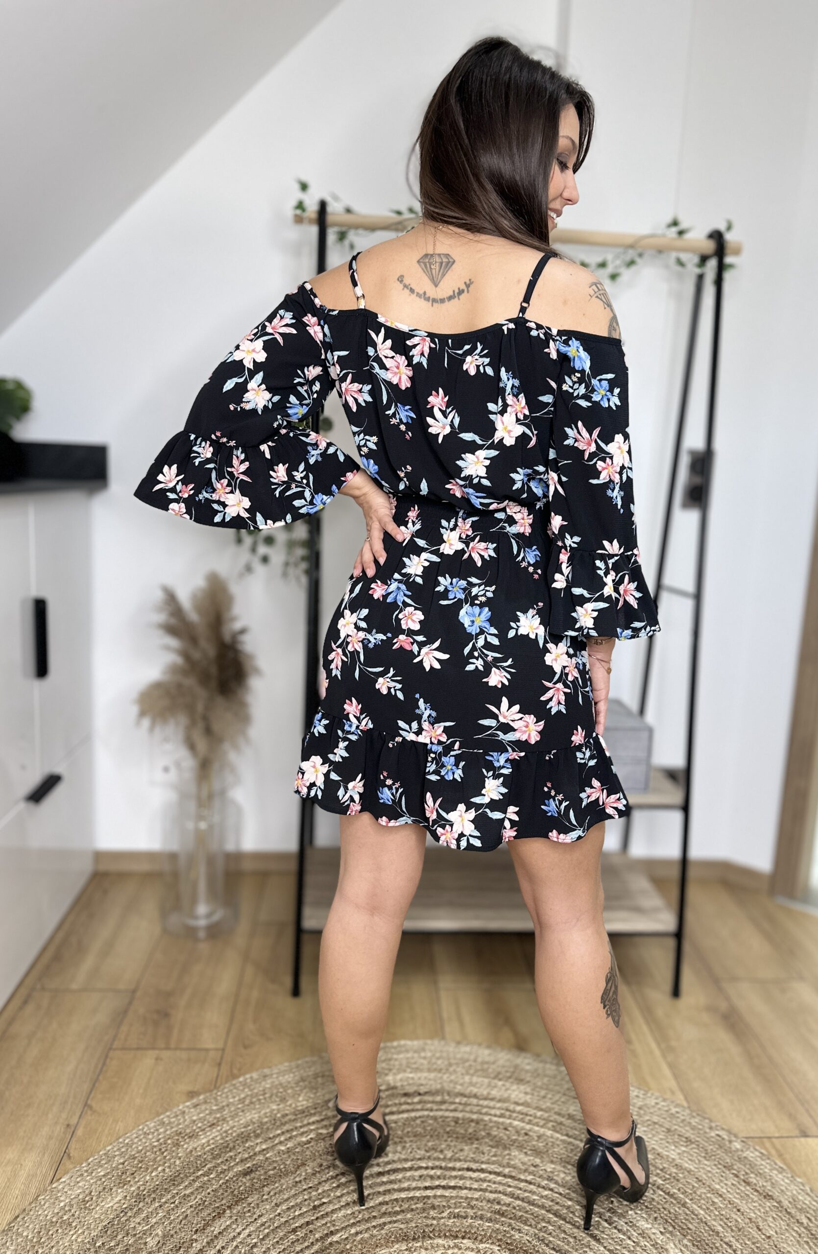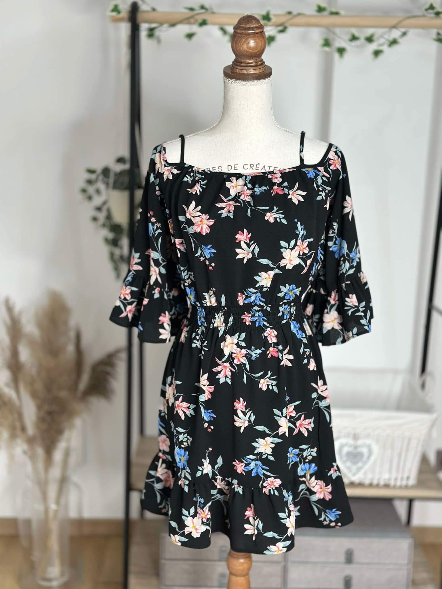 Robe noire courte à imprimé floral coloré avec épaules dénudées, manches à volants et taille élastique. Féminine et confortable, parfaite pour les beaux jours.