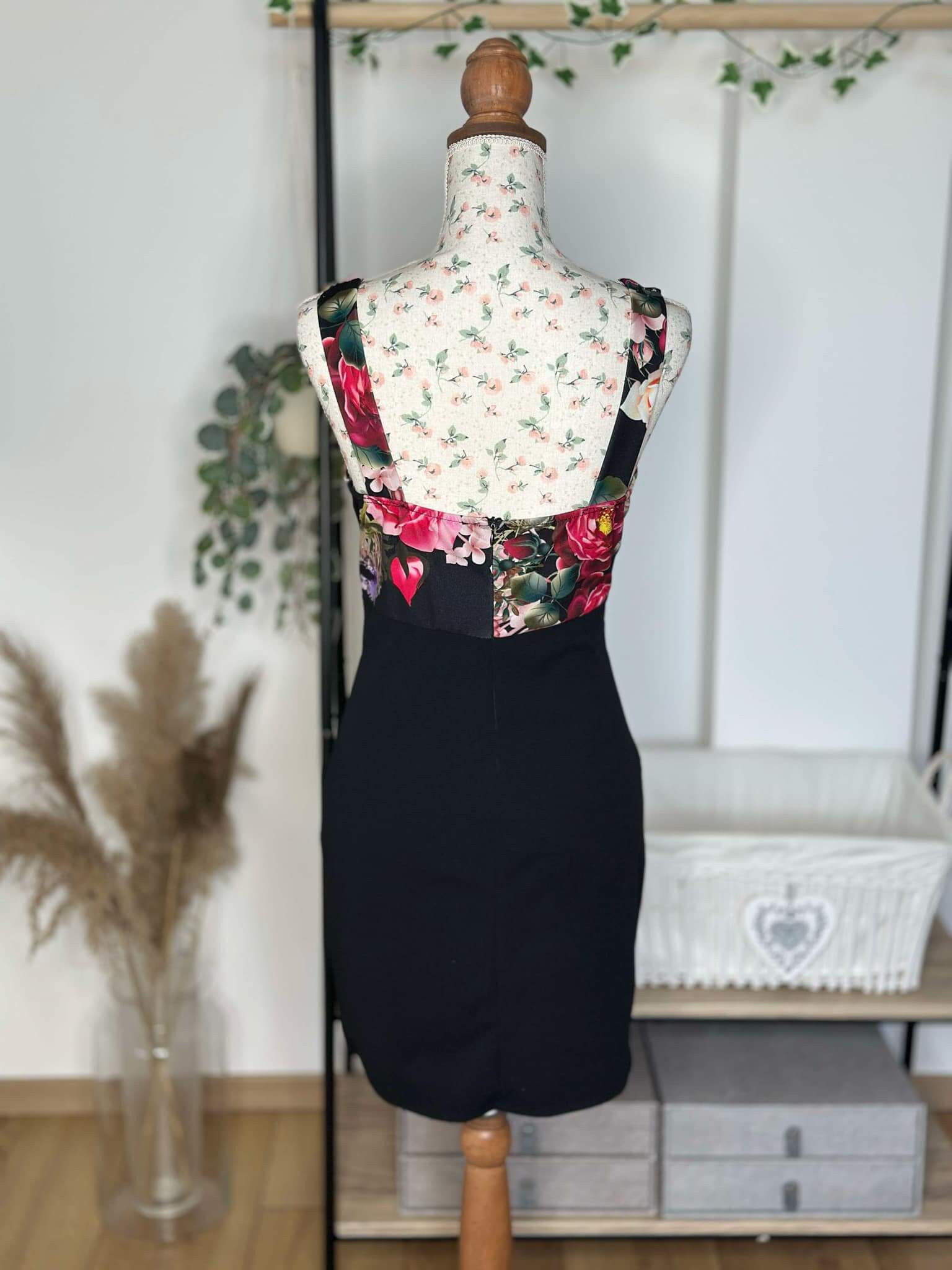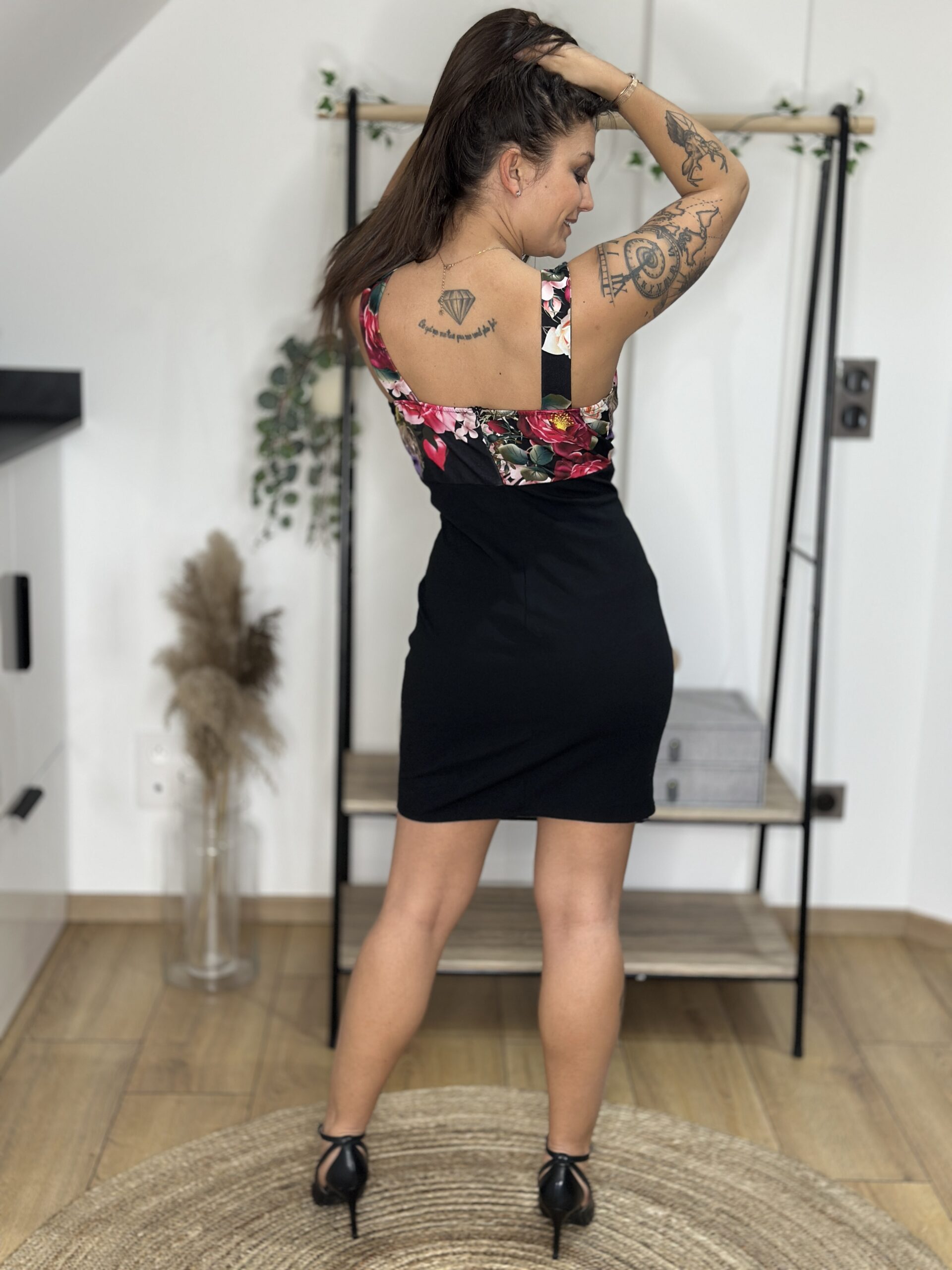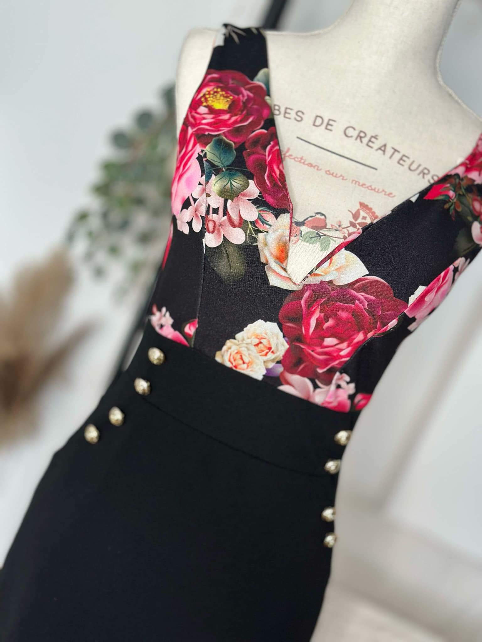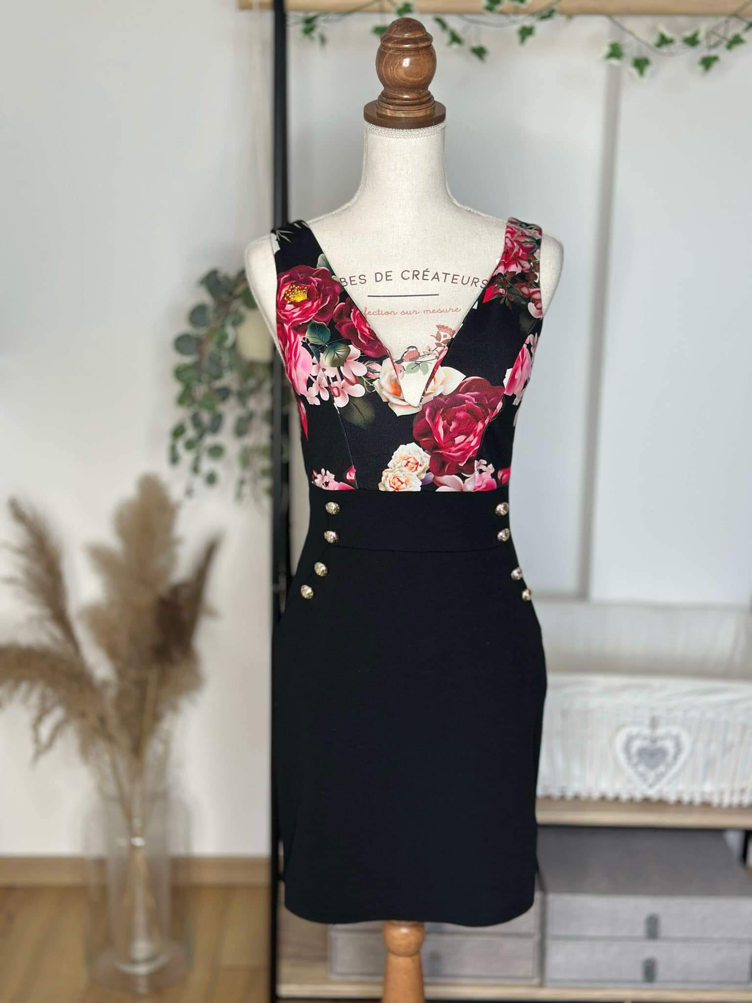 Robe chic à haut fleuri et jupe noire unie. Coupe près du corps avec détails de boutons dorés. Élégante et féminine, parfaite pour toutes occasions.