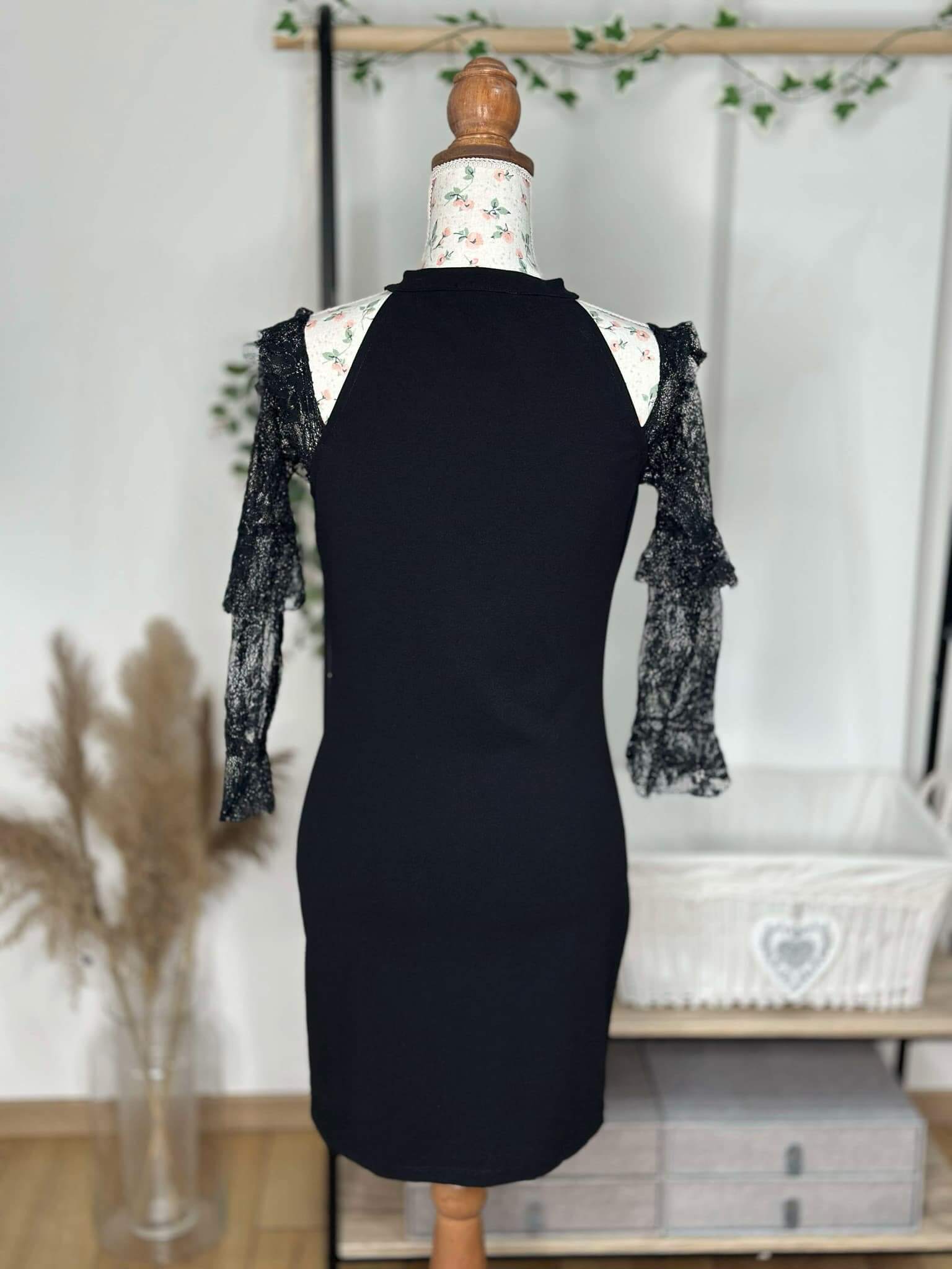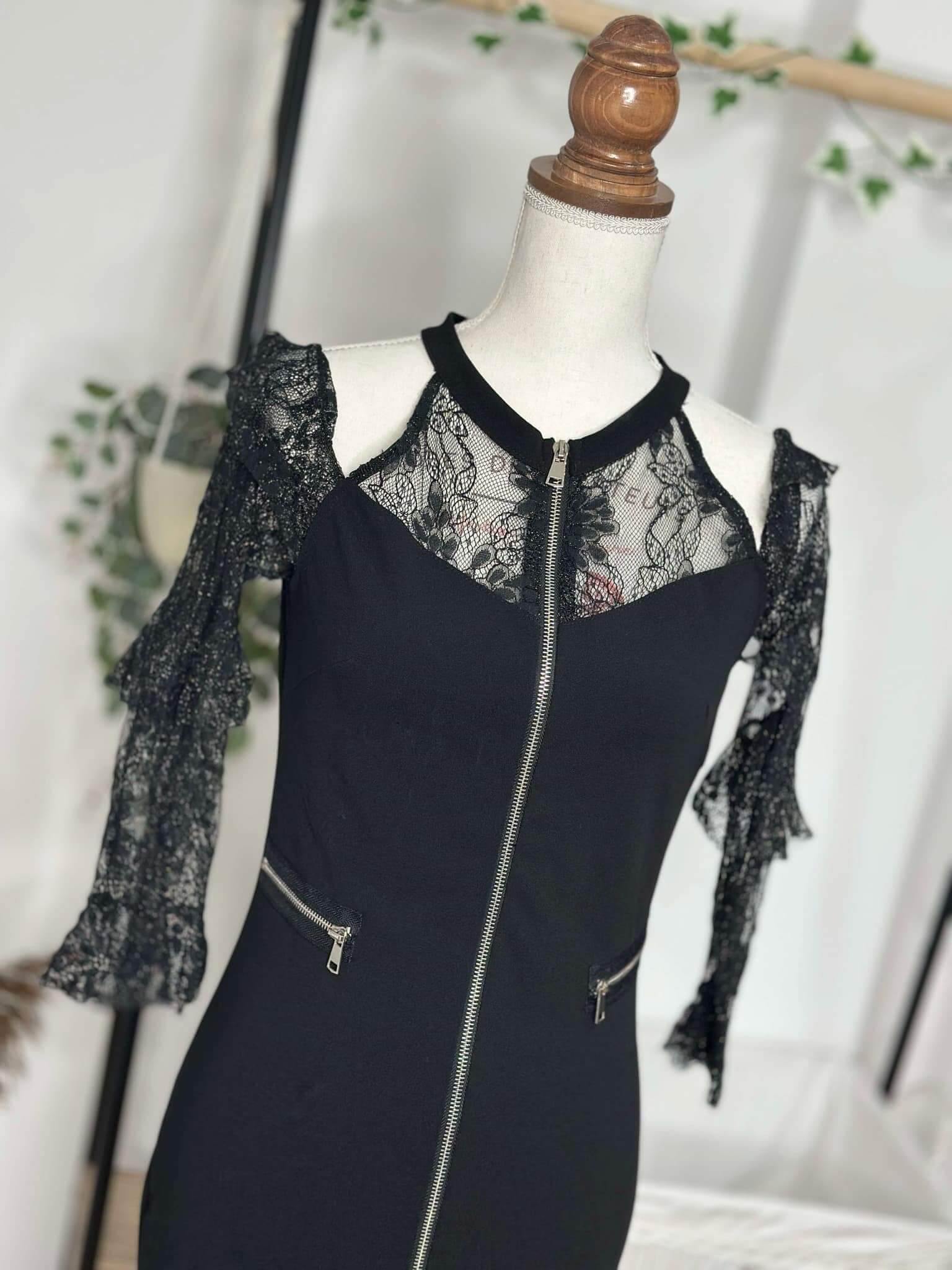 Robe noire chic en dentelle avec zip intégral, manches 3/4 évasées et coupe ajustée. Élégante, féminine et idéale pour briller lors de tes soirées.