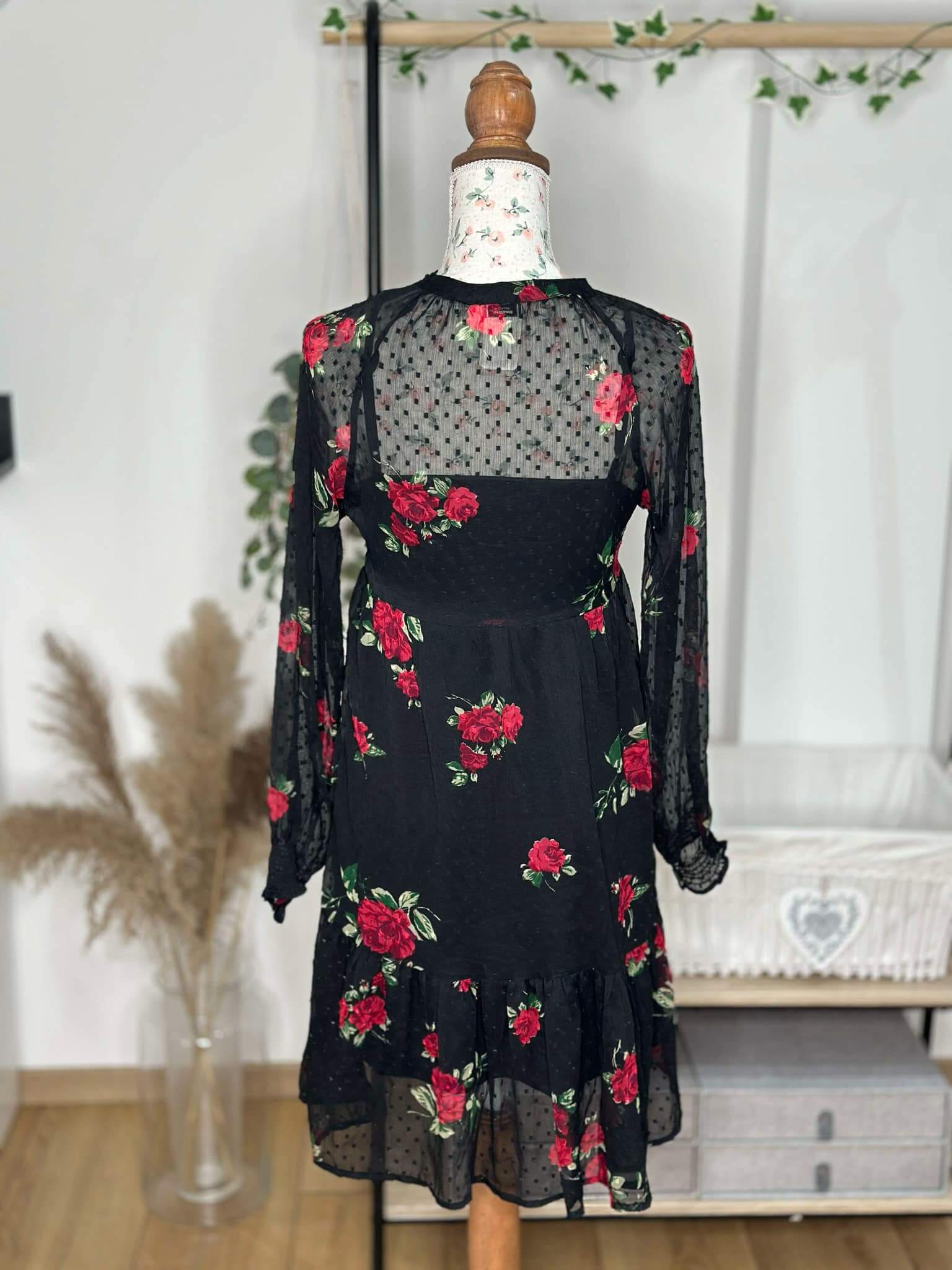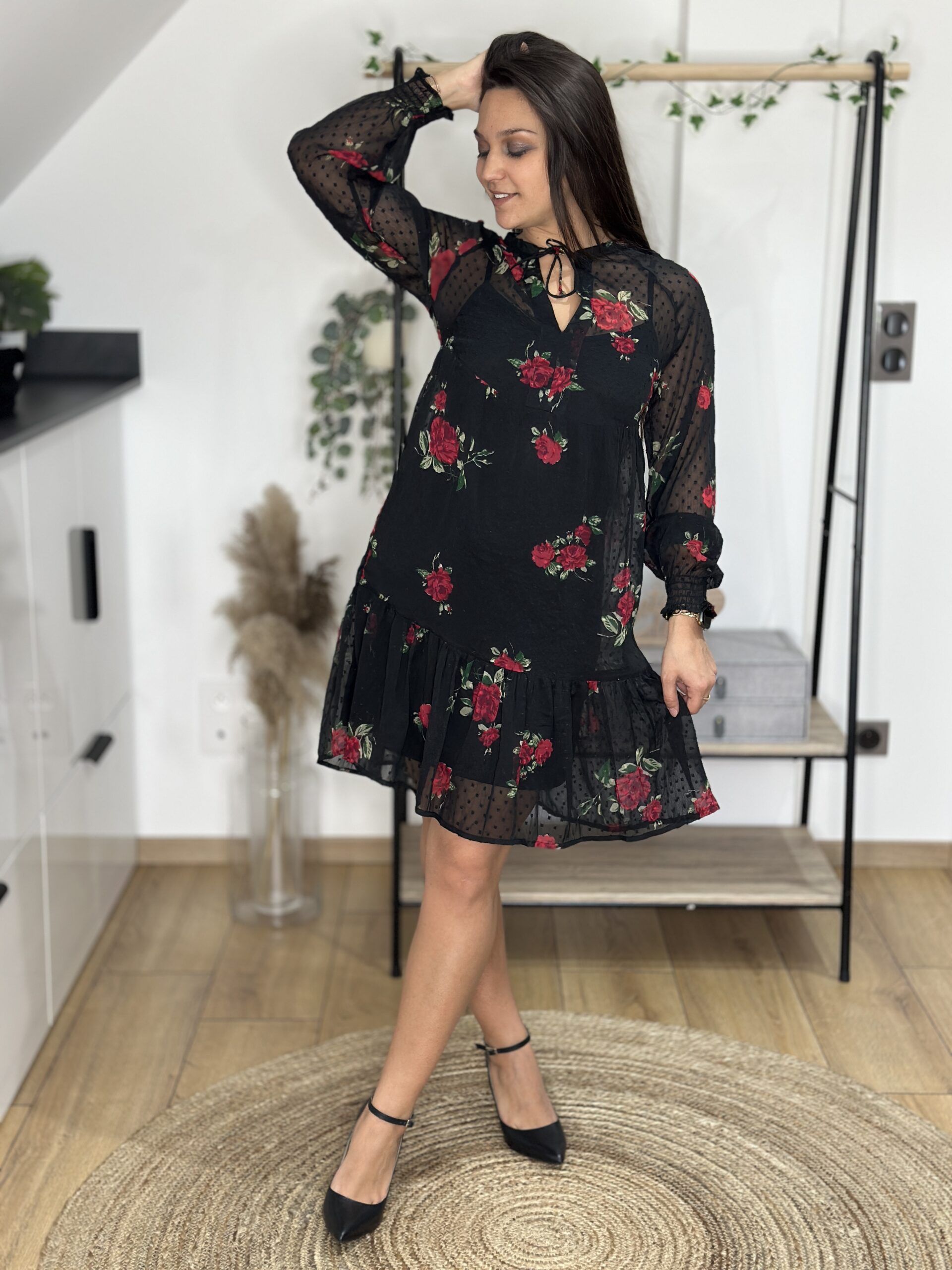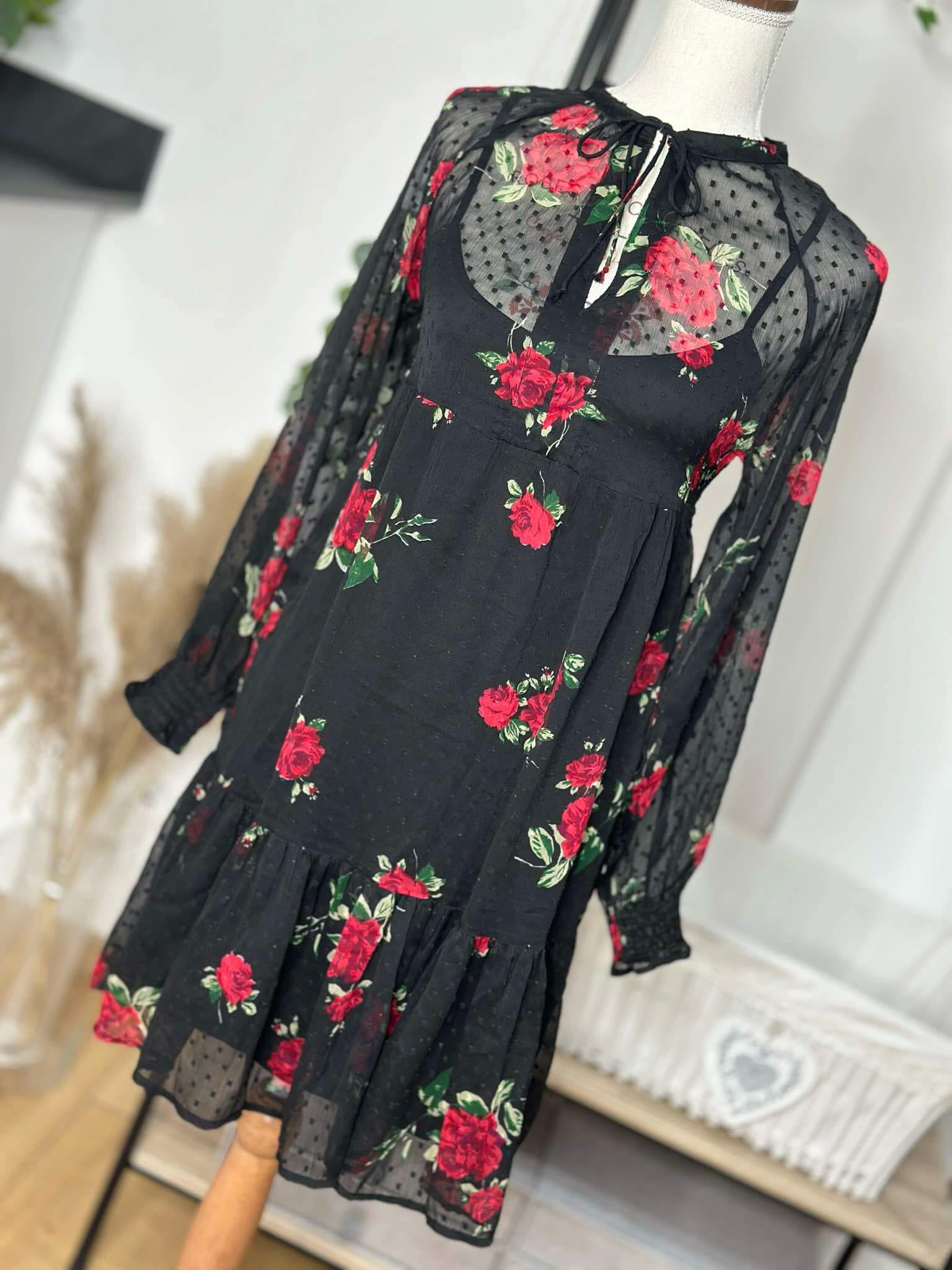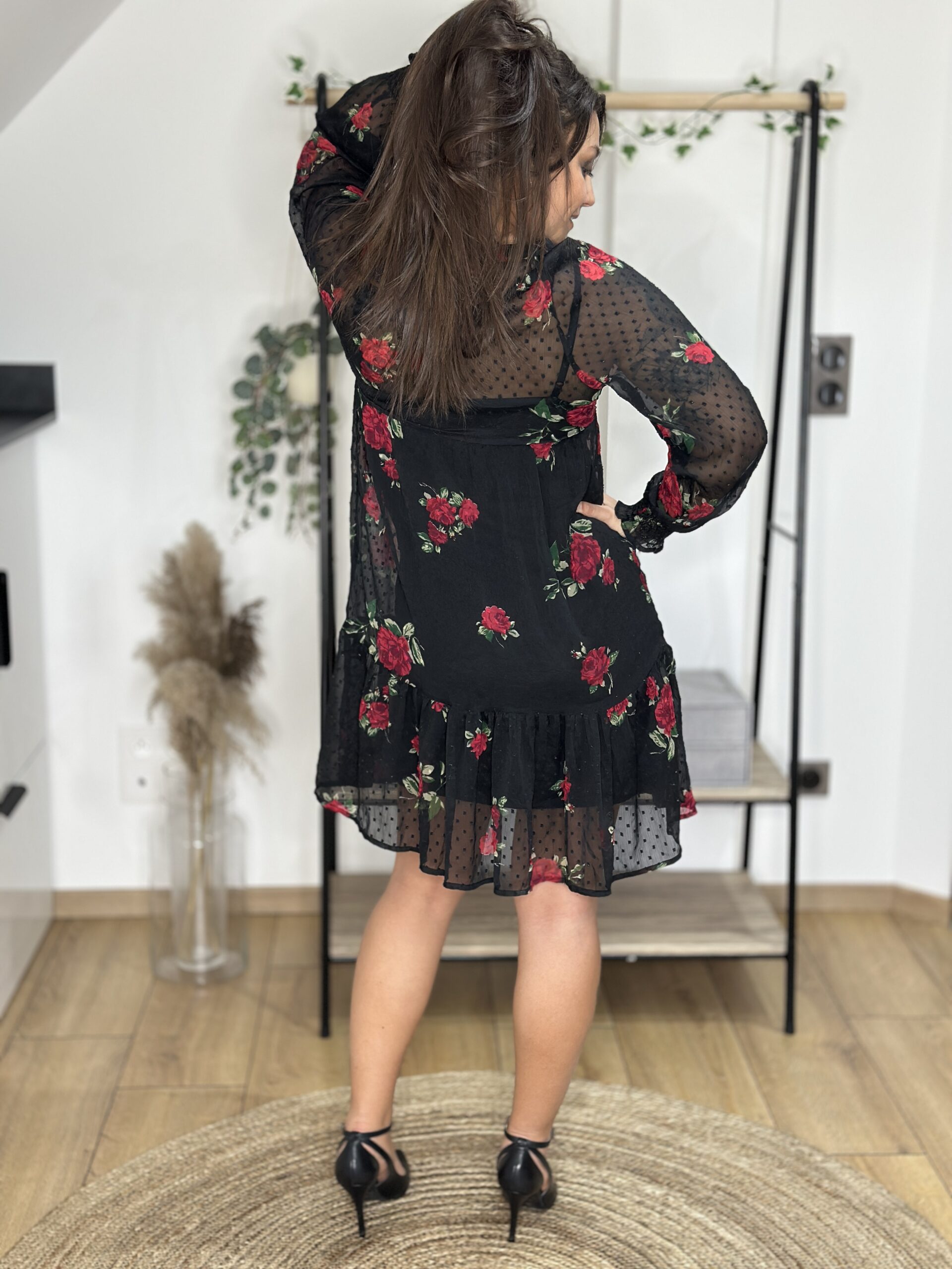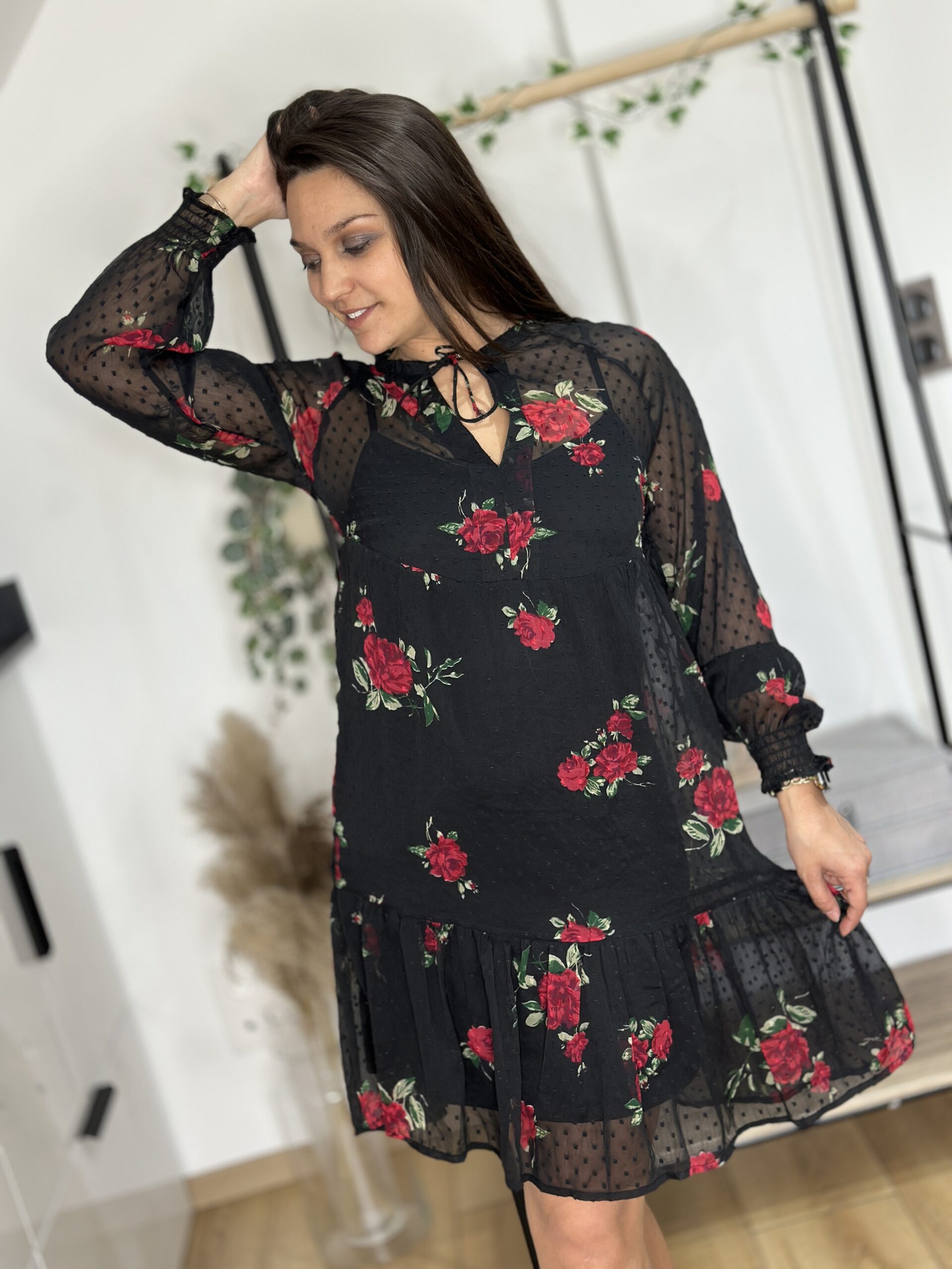 Laisse toi charmer par cette robe noire à l’esprit romantique et bohème. Sa coupe fluide est sublimée par un voile en tulle plumetis qui apporte transparence et légèreté aux manches et à la base. Son imprimé floral rouge illumine la silhouette avec délicatesse.