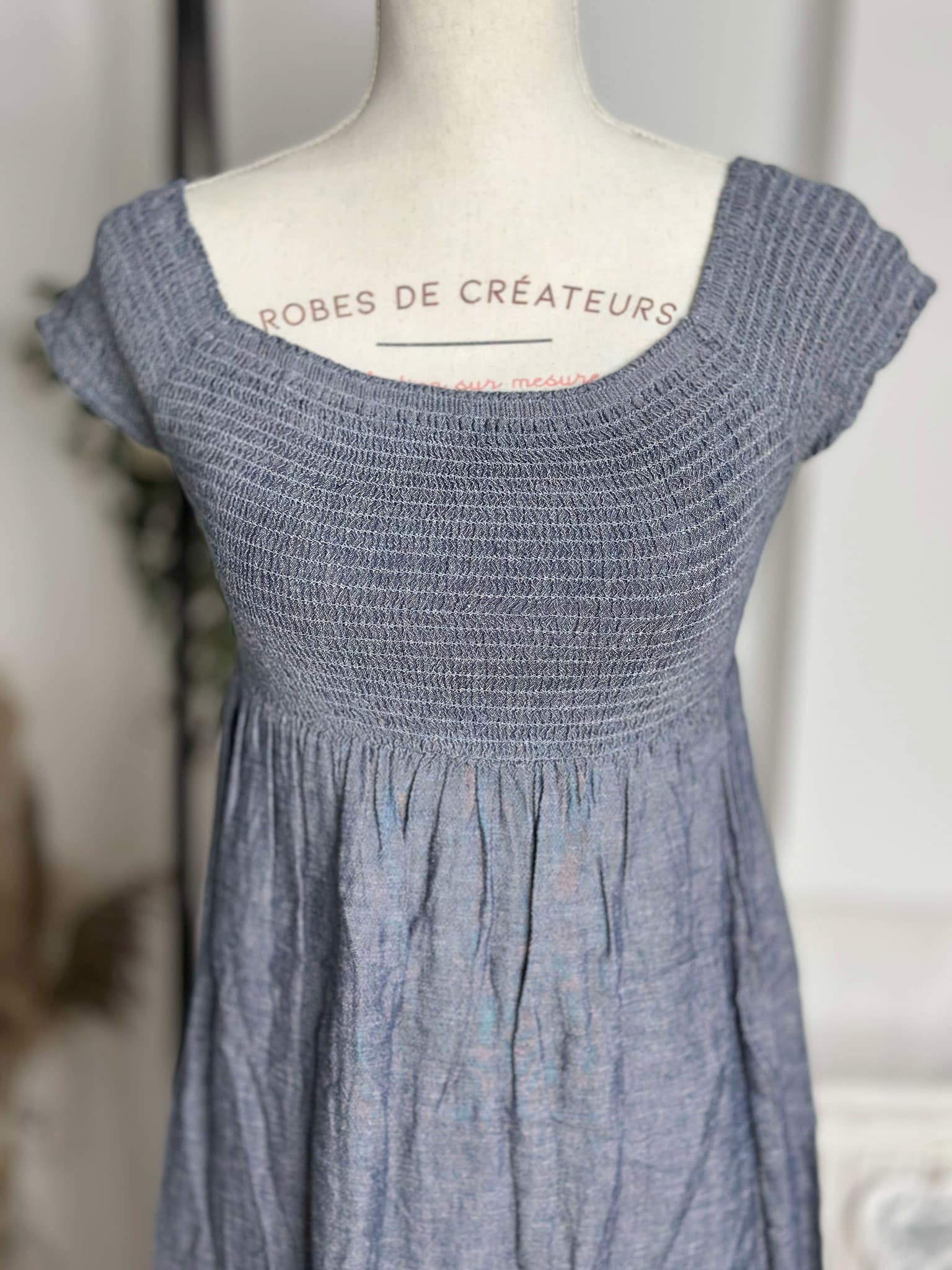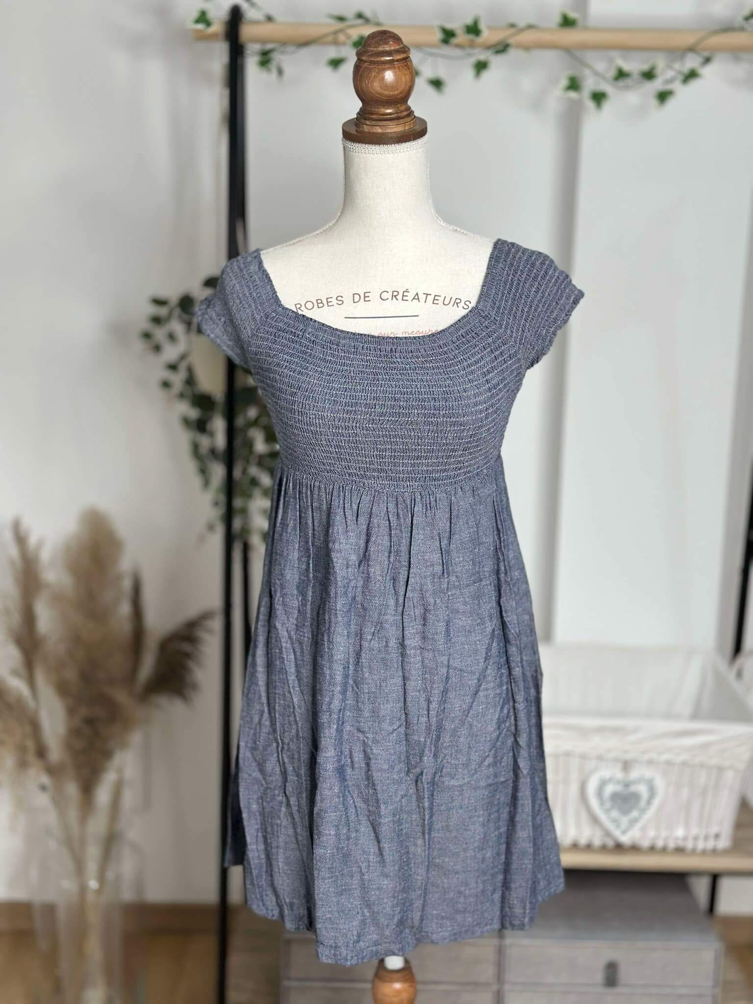 Robe courte bleu jean effet froissé, haut smocké et jupe évasée. Légère, féminine et idéale pour la belle saison.