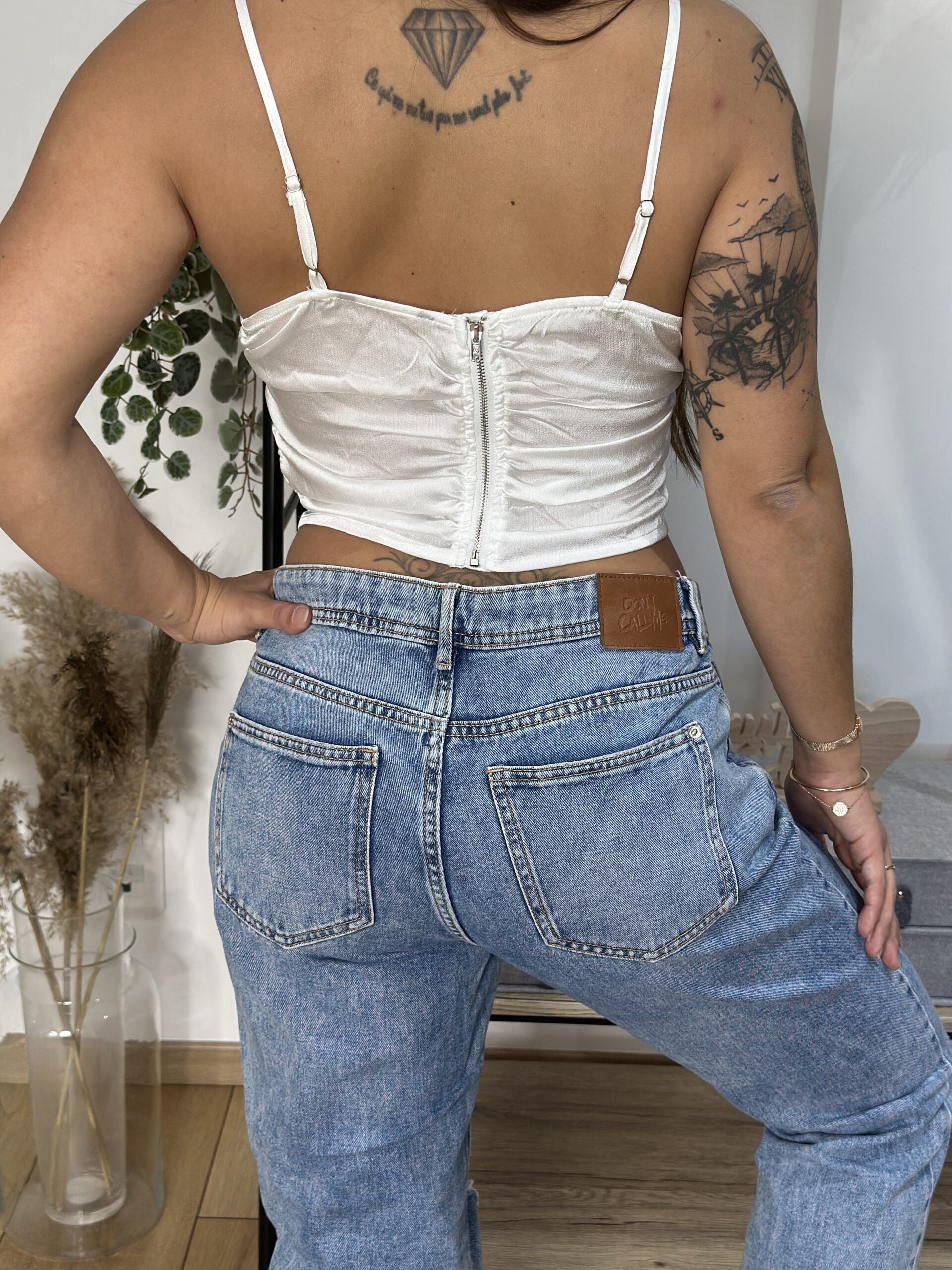 Top blanc satiné à fines bretelles réglables, avec laçage sur le devant et zip au dos. Élégant, ajusté et parfait pour vos looks de soirée ou d’été.