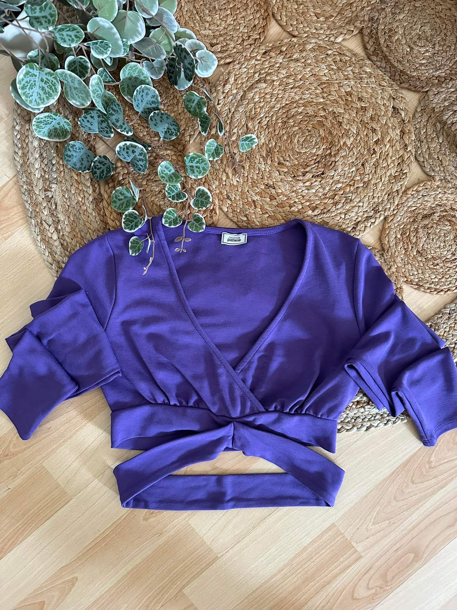 Top violet à manches longues, coupe courte croisée façon cache-cœur avec effet ceinture drapée. Féminin, flatteur et confortable.