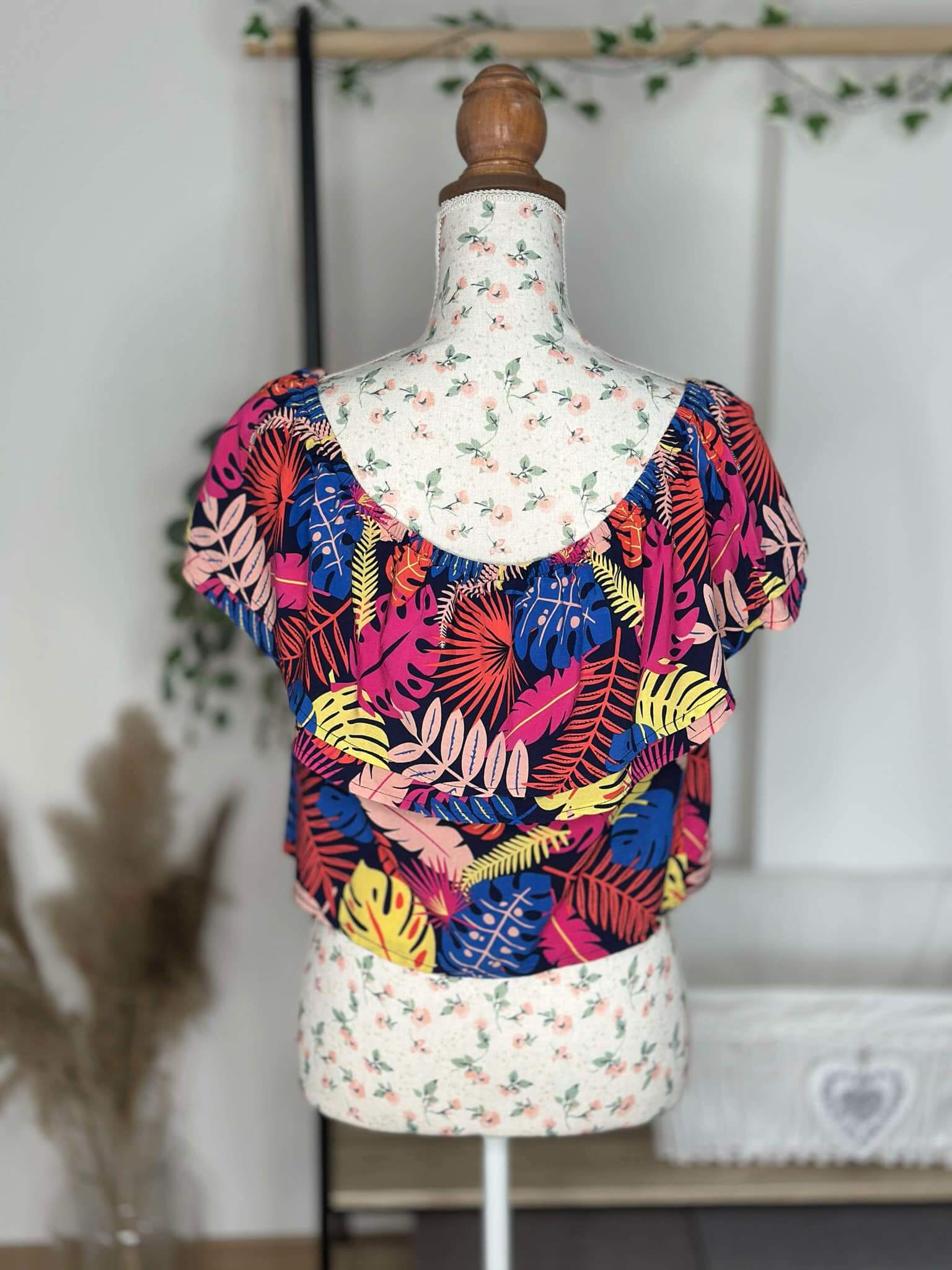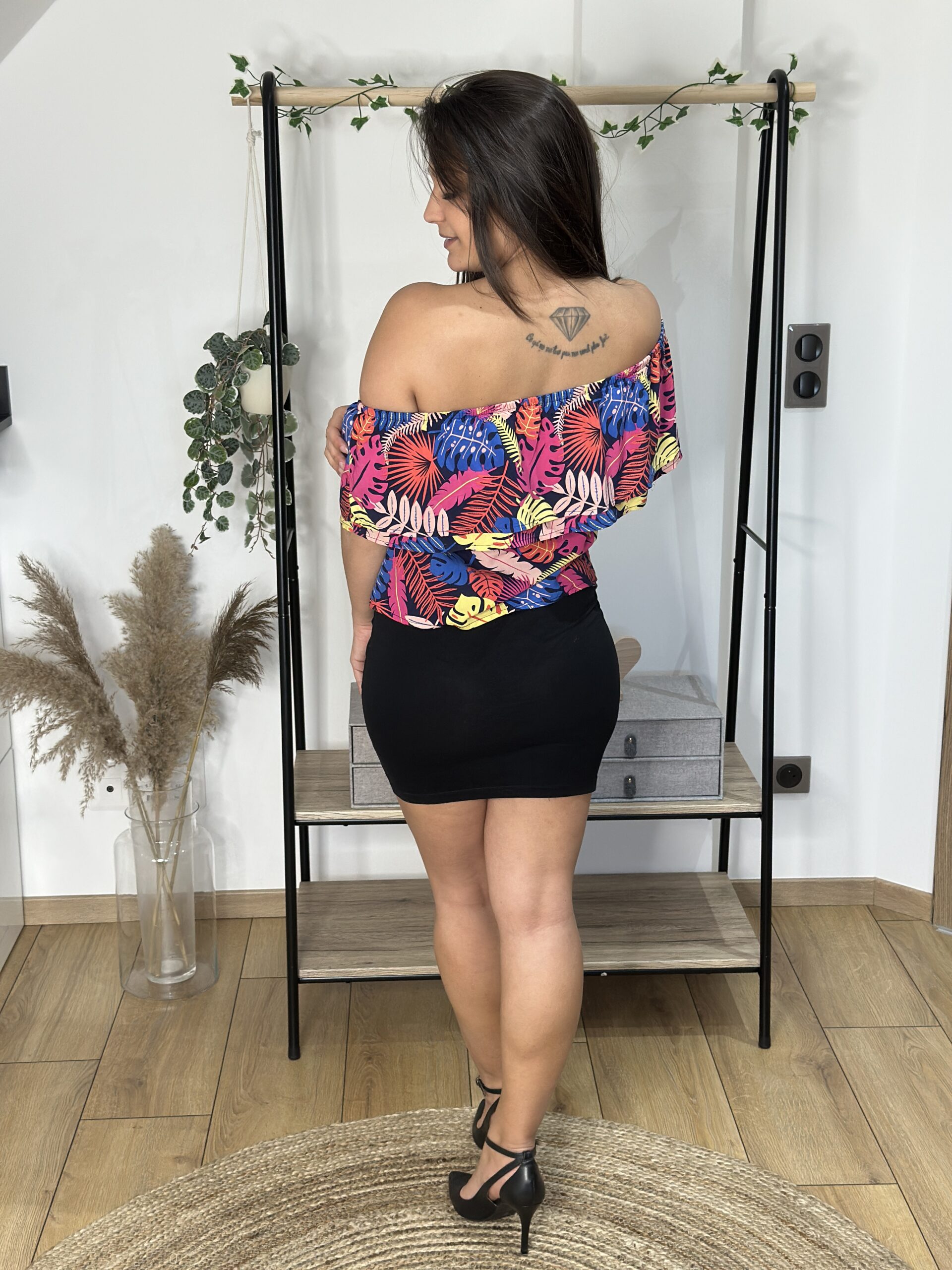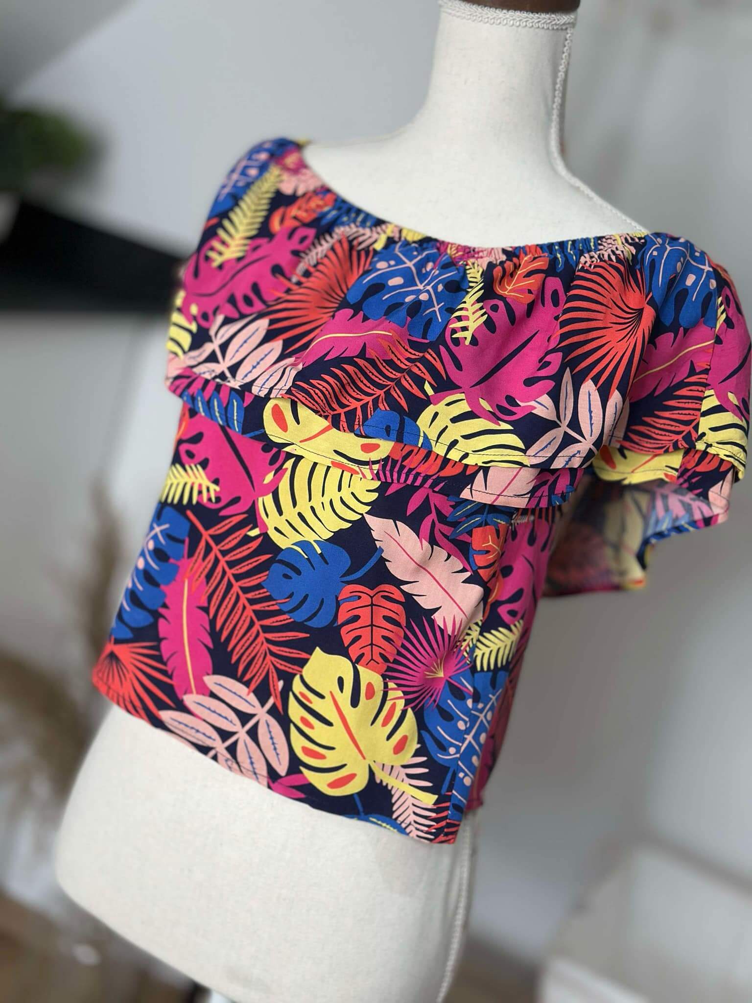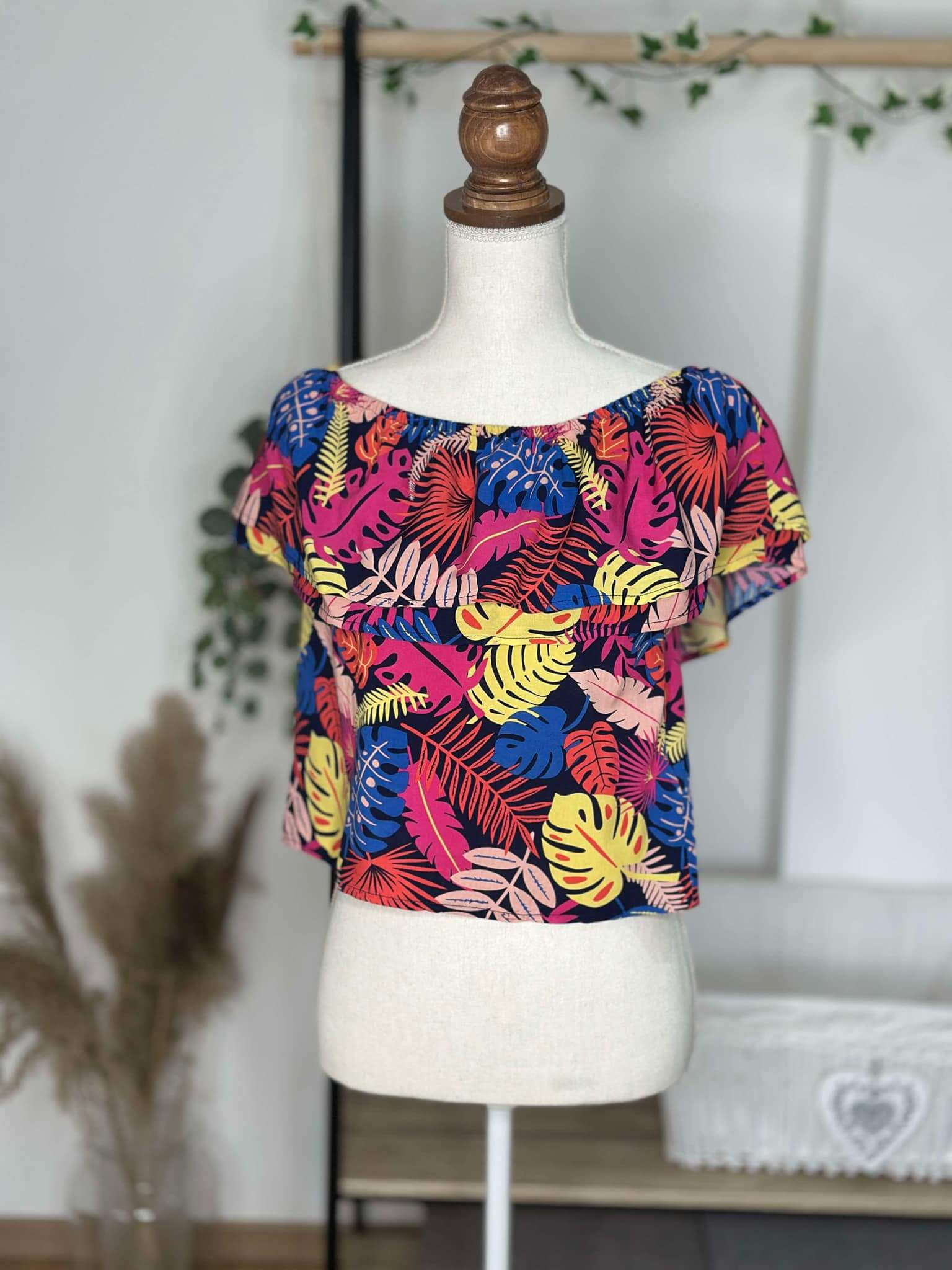 Top tropical à épaules dénudées, imprimé multicolore. Léger, fluide et idéal pour un look estival vibrant et tendance.