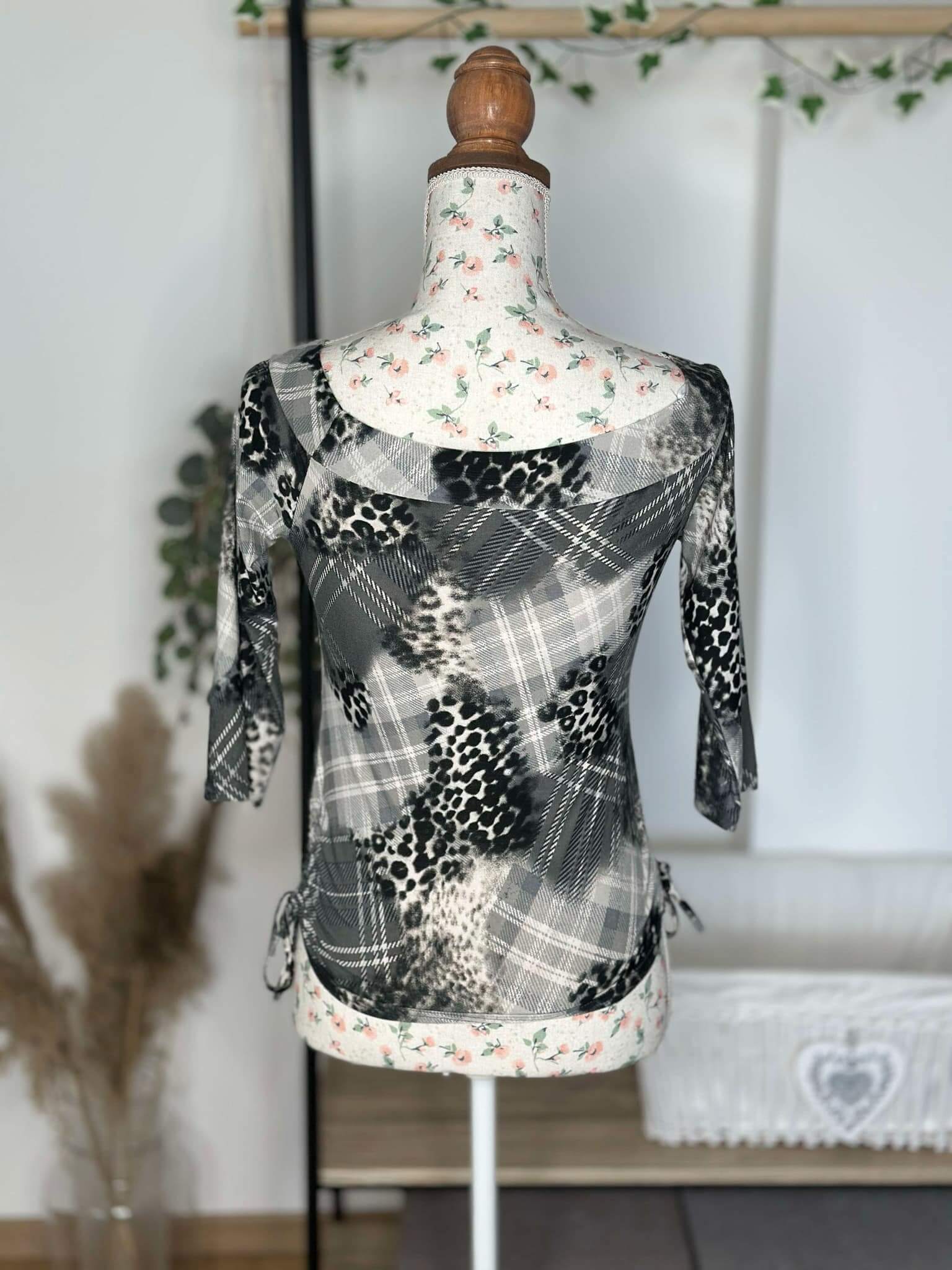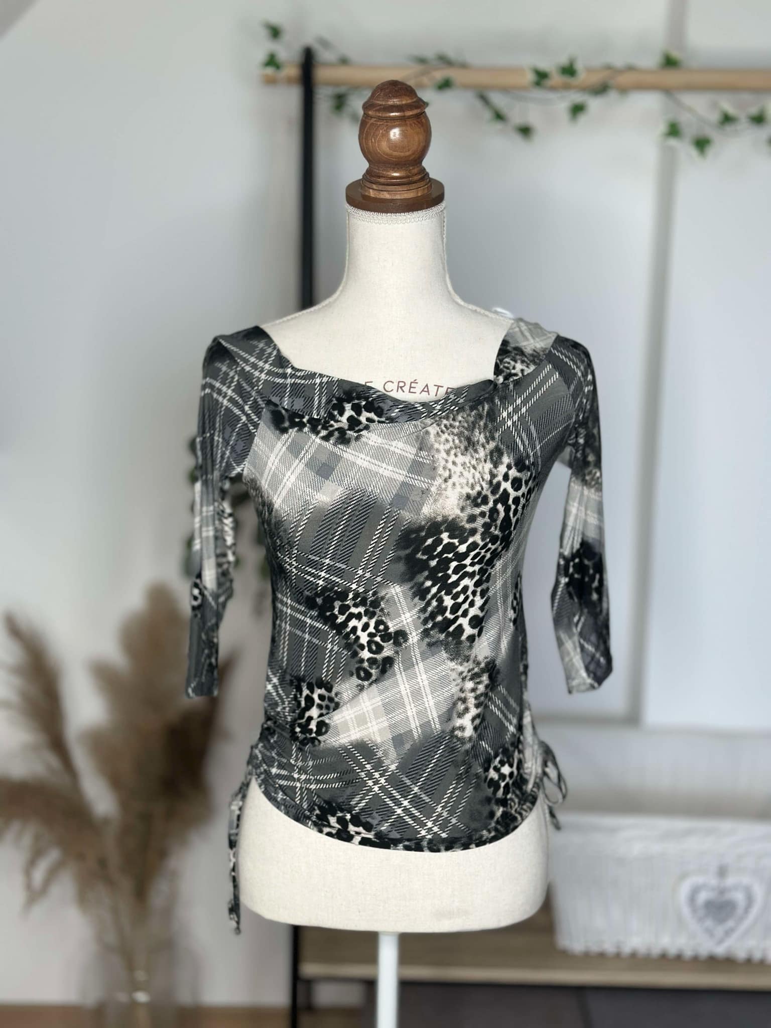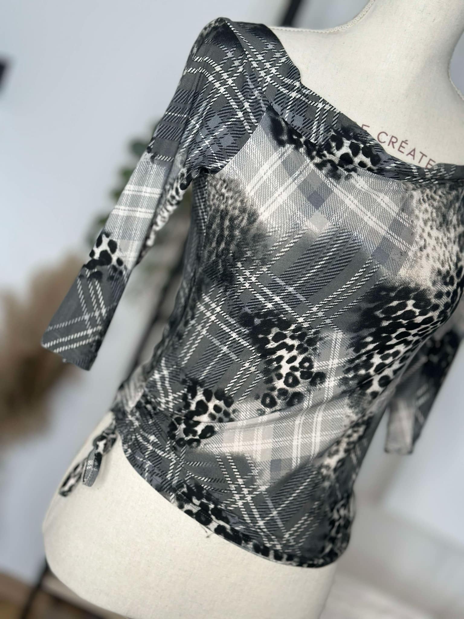 Top original à imprimé mixé léopard et carreaux gris. Coupe près du corps avec col drapé asymétrique et manches 3/4. Style audacieux et moderne.