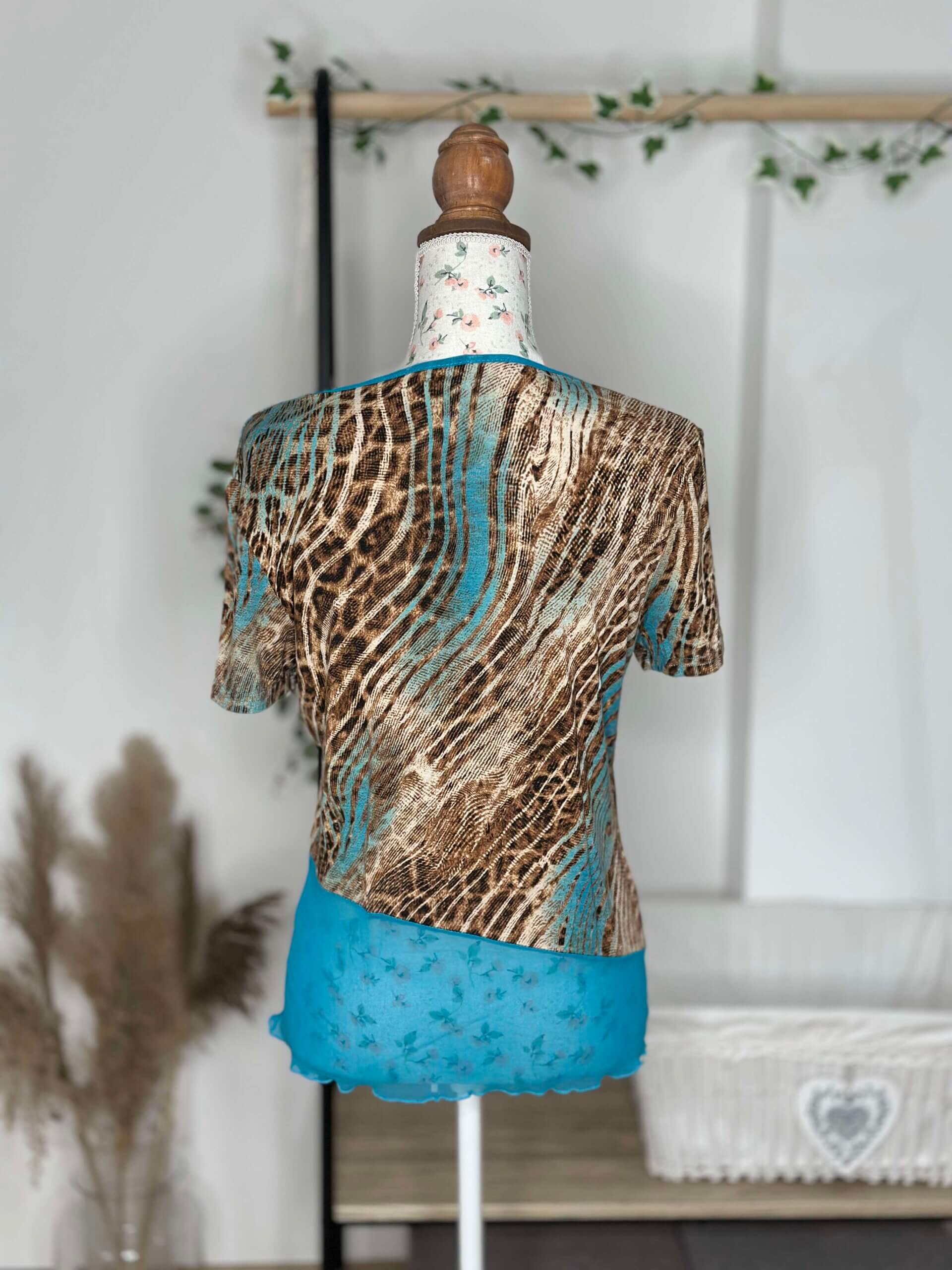 Fais ressortir ton style avec ce top imprimé unique, mêlant des motifs animaliers marron et effets ondulés turquoise, sur une base fluide en superposition bleue. Ce haut à col rond et manches courtes offre une coupe décontractée, parfaite pour apporter du pep’s à une tenue quotidienne.