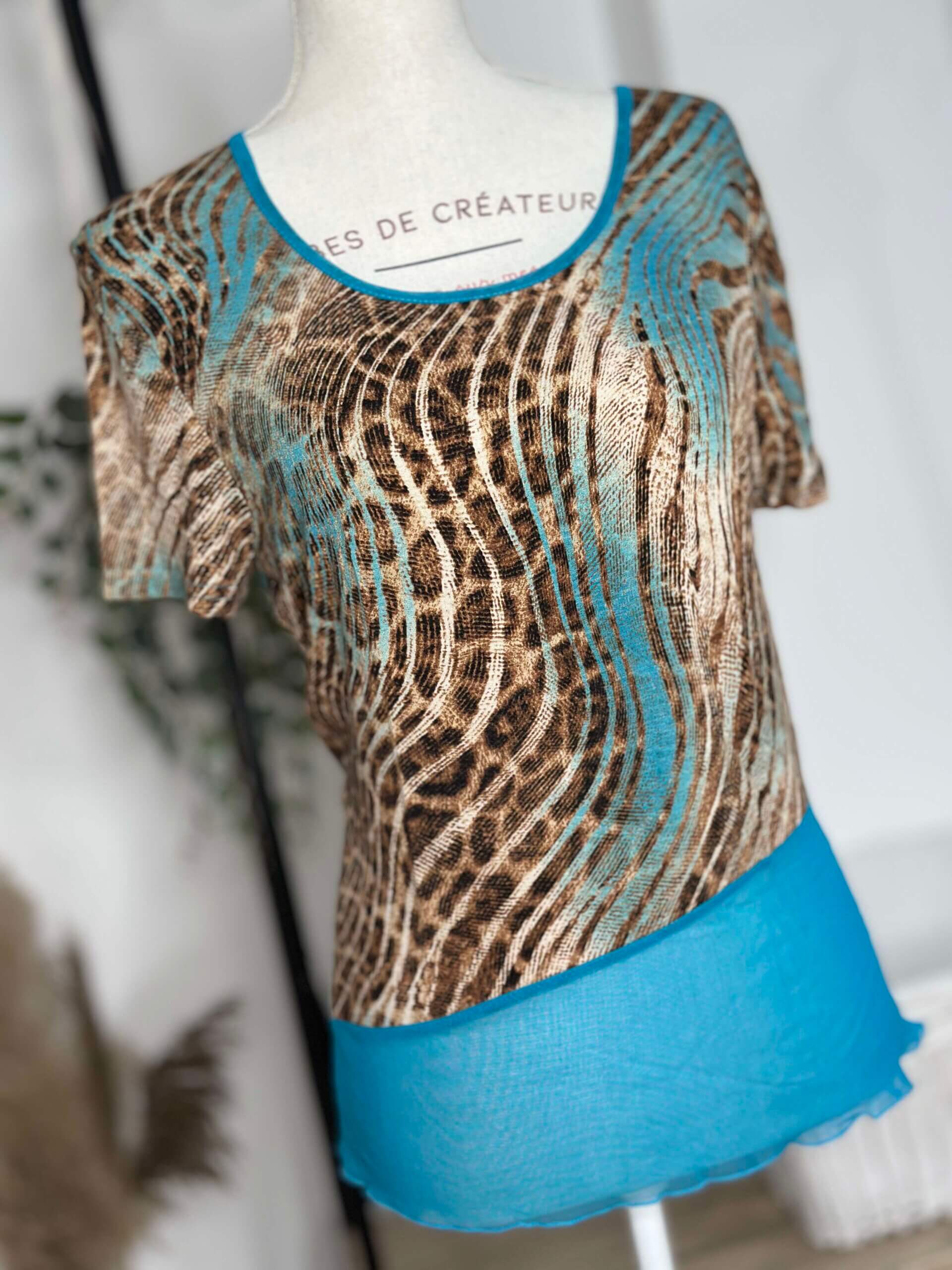 Top léger femme à imprimé léopard et vagues turquoise. Matière fluide, col rond, bas contrasté. Parfait pour un look estival tendance et original !