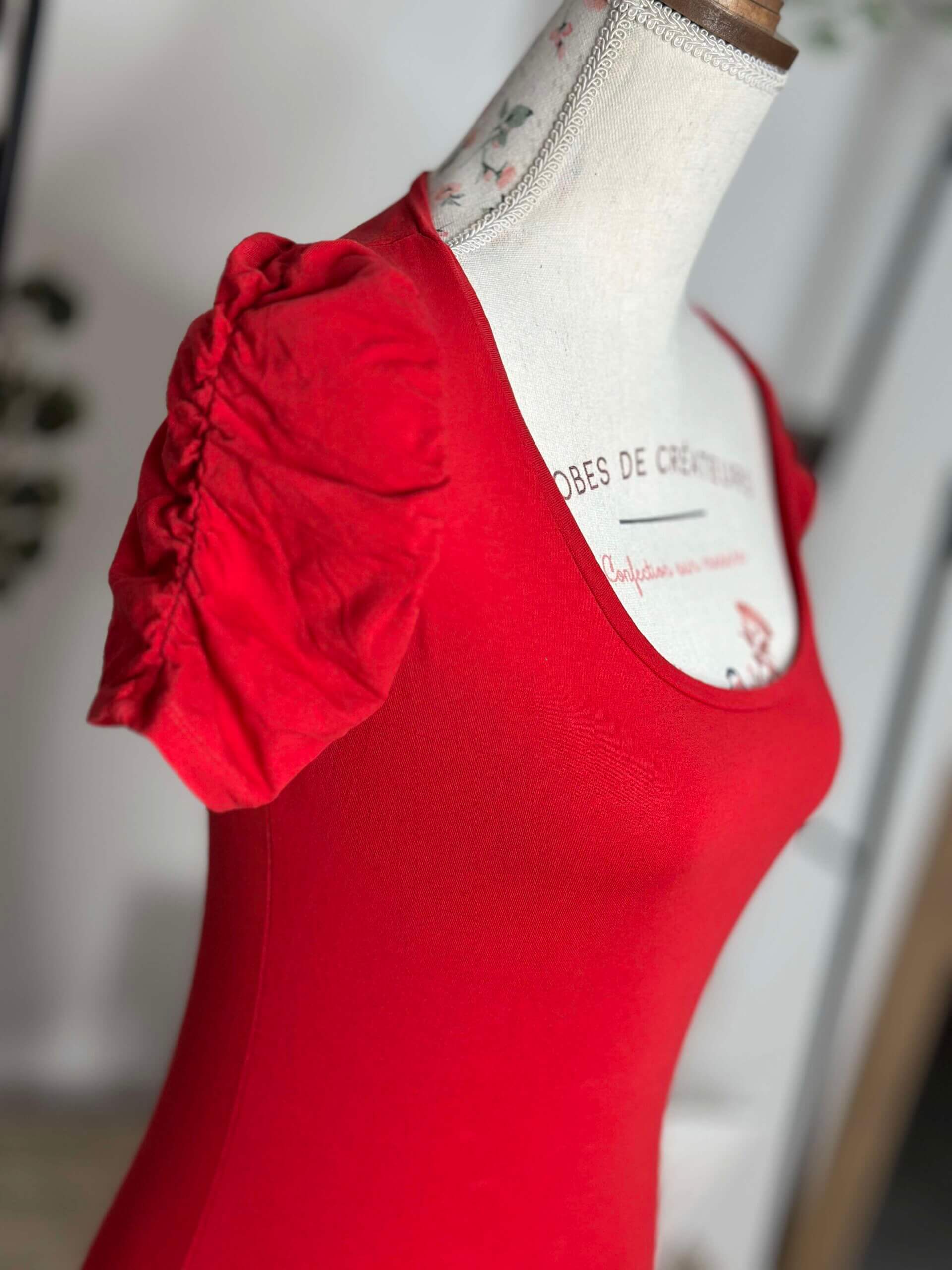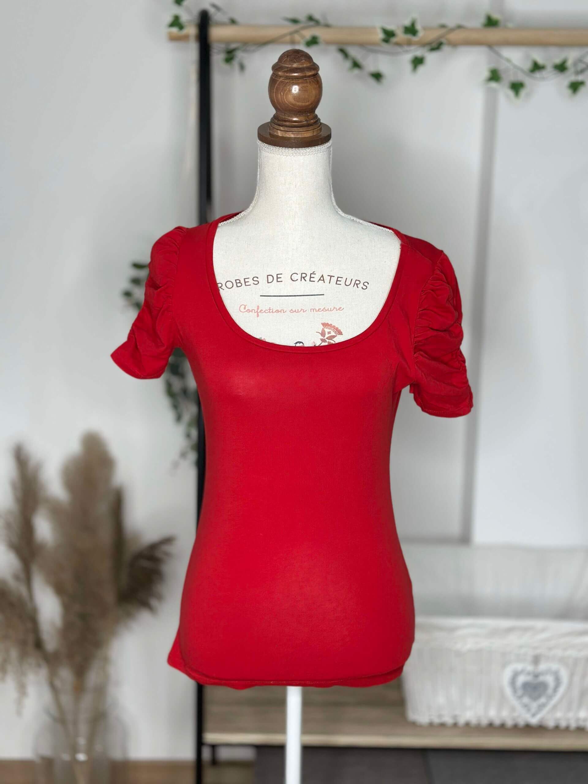 Top rouge à col carré, coupe près du corps avec manches courtes froncées. Un basique élégant et féminin, idéal au quotidien.